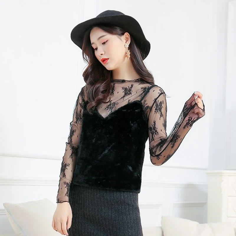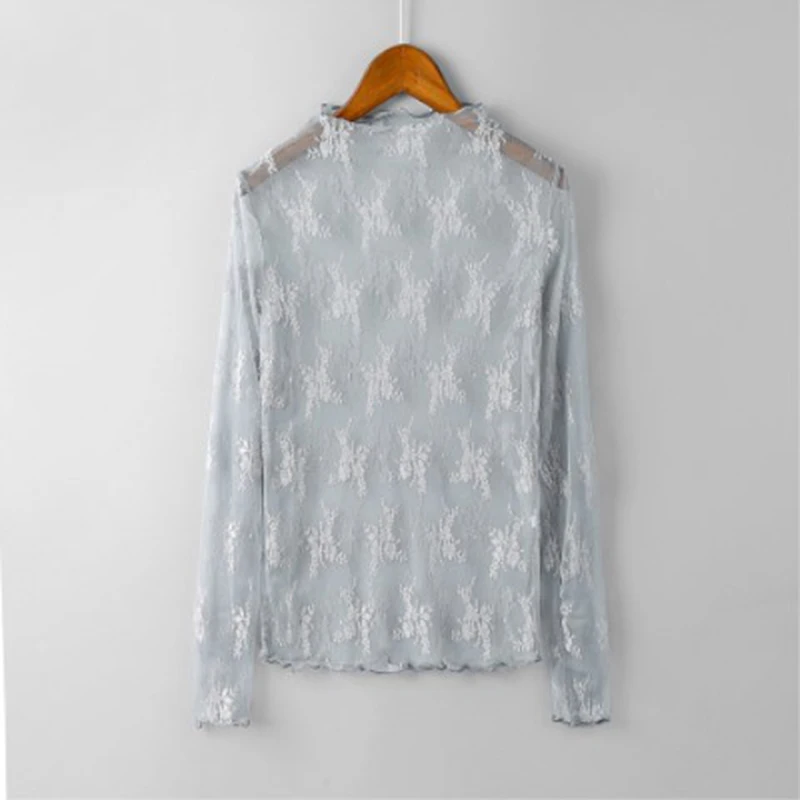 Женские кружевные блузки, женские топы с оборками, сексуальные сетчатые блузки, прозрачная блузка с длинным рукавом, черная рубашка в горошек со звездой, блузка DD8097
