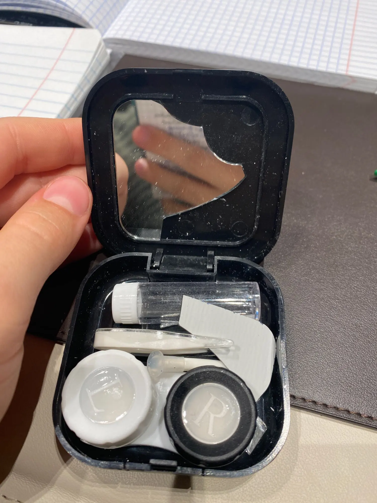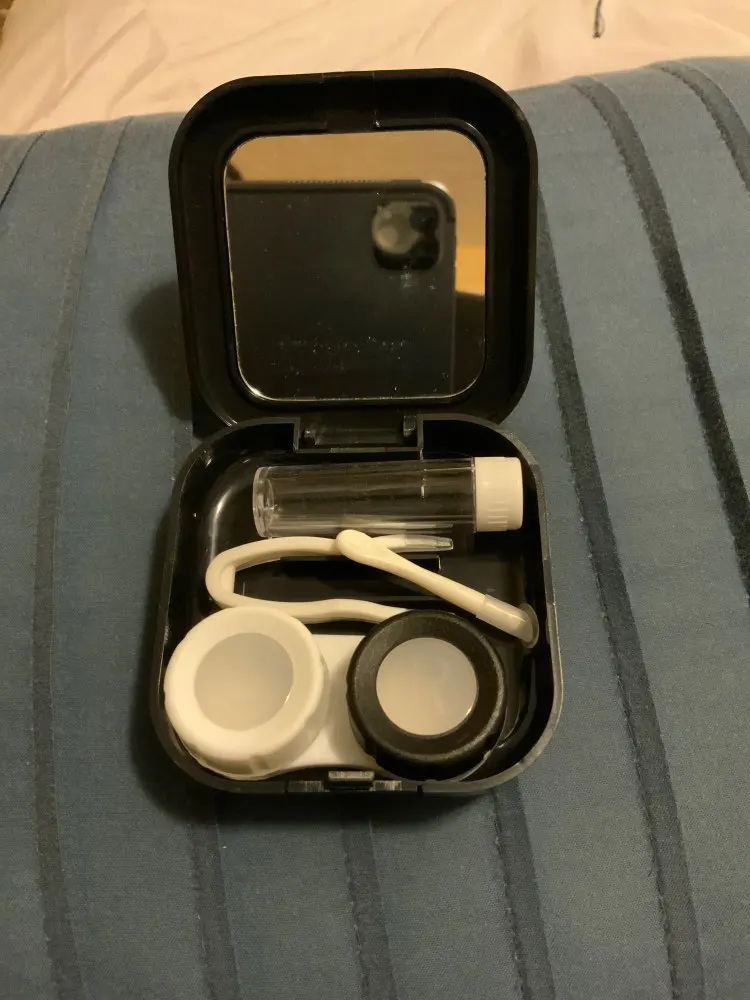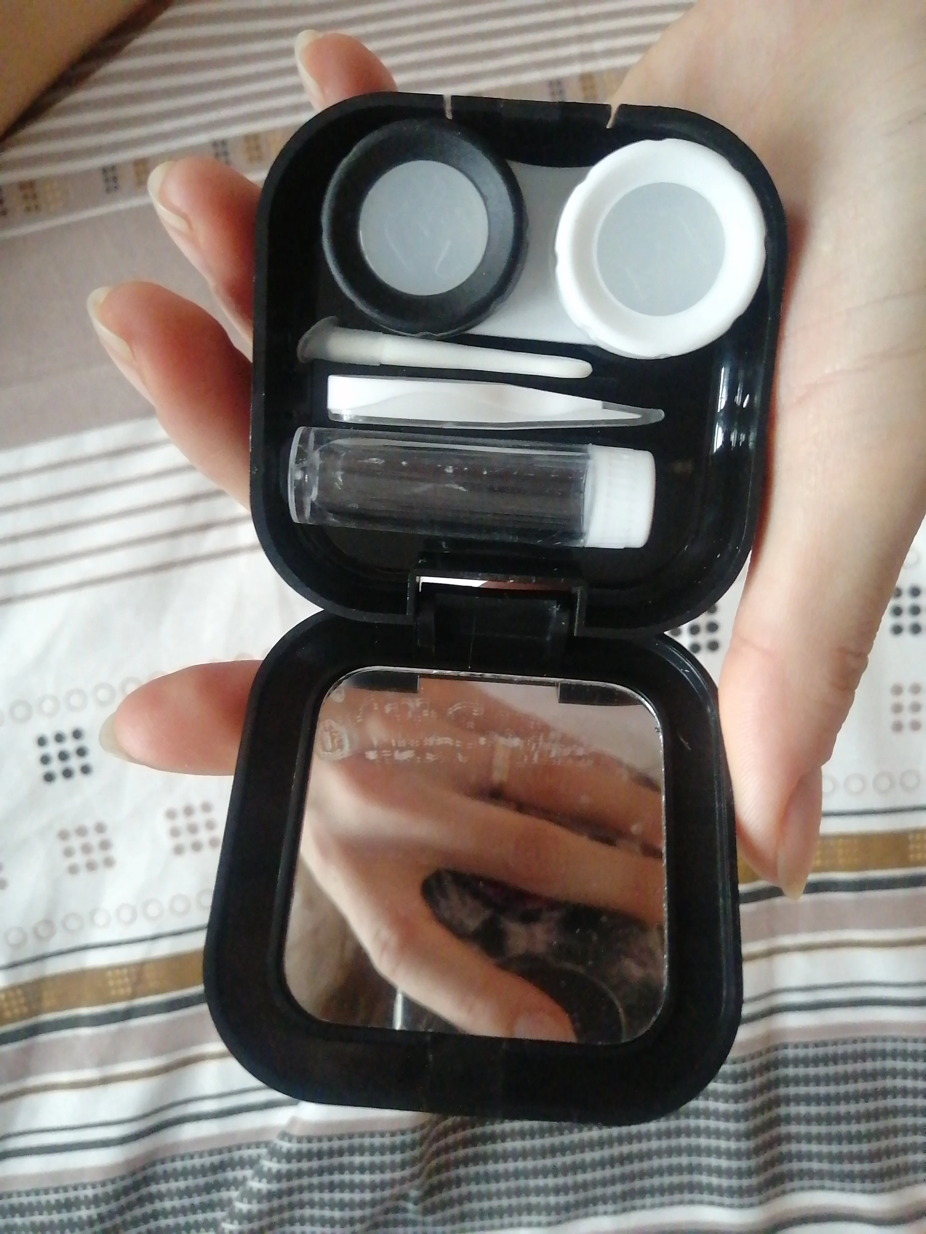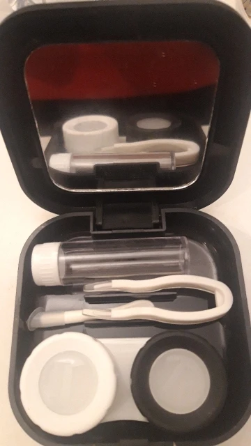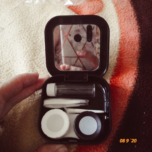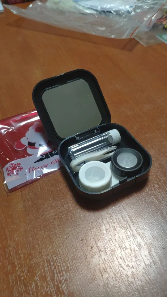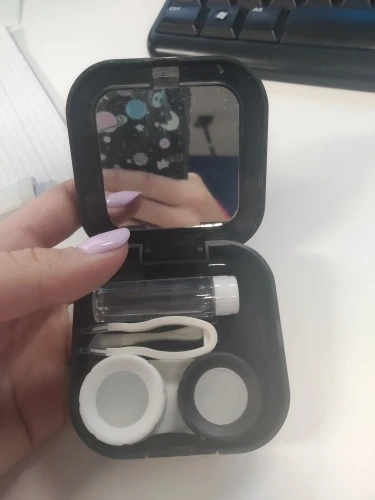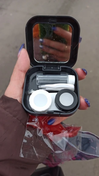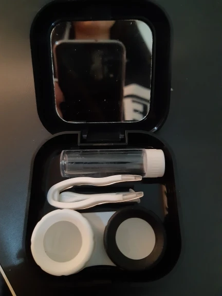 хороший набор. имеется зеркало. классный пинцет и присоска шоб легко надевать линзы. хороший контейнер. хорошая мини бутылочка для жидкости линз и она очень плотно закрывается. ничего не протекет, но масенький минус это криво приклеена корона
