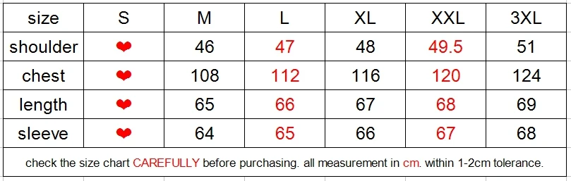 Пожалуйста, проверьте таблицу размеров и измерьте вашу куртку, как показано ниже.