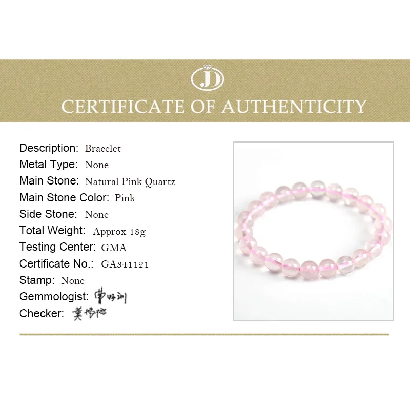 Очень красивый quartz розовый кварцевый браслет! Рекомендовано. Заказ: 15 января 2021/Отправка: 20 января 2021/Доставка: 30 января 2021 Стандартная доставка AliExpress (Yanwen international express) Время доставки: 10 дней. Быстрая доставка. Товар был получен в хорошем состоянии и вовремя. Отличная защитная упаковка: двойная пузырчатая пленка. Розовый кварцевый браслет 7-8 мм-23 бусины, 18 гр. Соответствует указанному описанию. Коммерческое Качество: 2 бракованных бисера. Продукт оправдал ожидания. Идеальное общение, быстрый ответ. Хорошая сделка. Я снова куплю в ювелирном магазине JD Gemstone Factory Store. Приятно иметь дело с отзывчивым и вежливым продавцом. Я ценю ваш прекрасный подарок. Это было очень мило с вашей стороны. Спасибо.♡С наилучшими пожеланиями и с Новым годом!