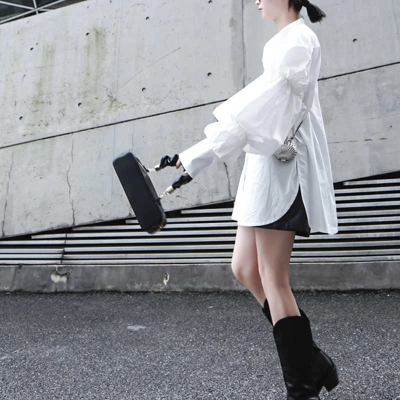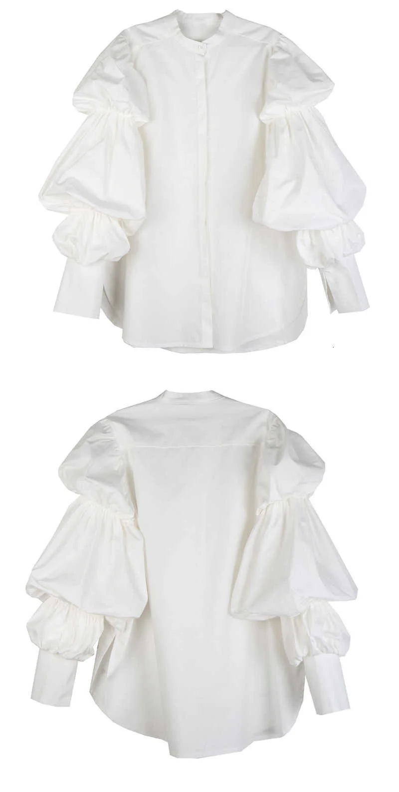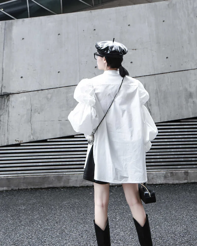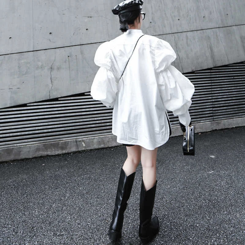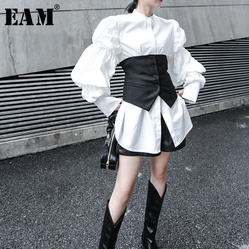 EAM Женская белая плиссированная блуза большого размера с разрезом, новая свободная рубашка с воротником-стойкой и пышными рукавами, модная весенне-осенняя 2022 1K366