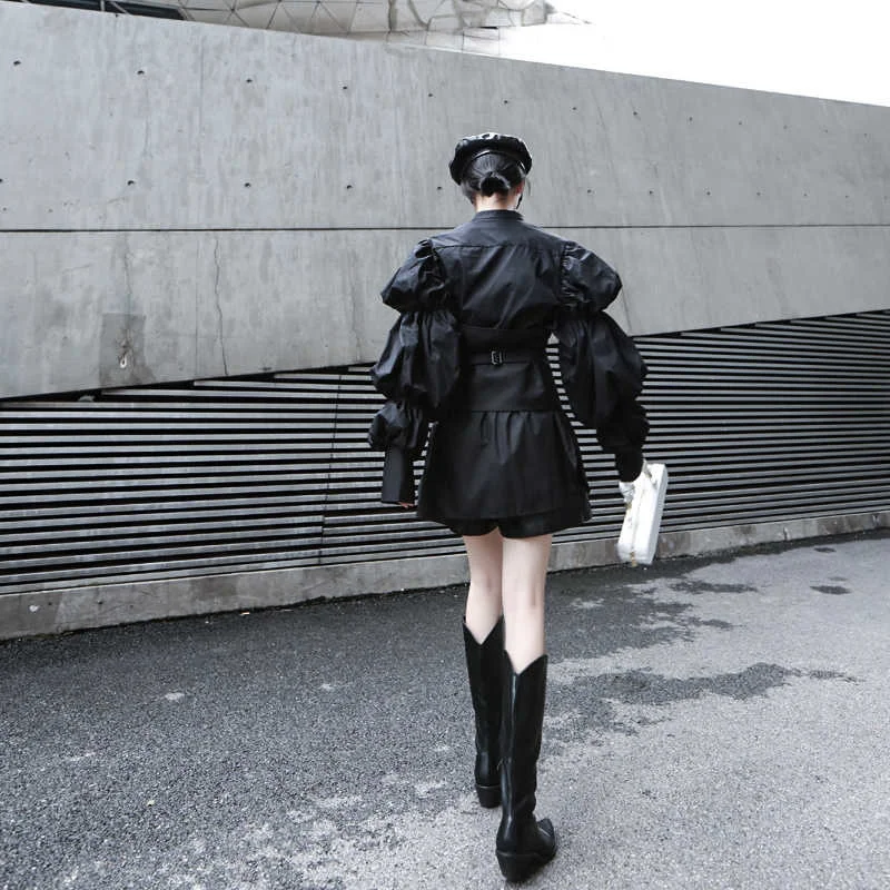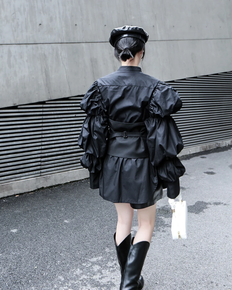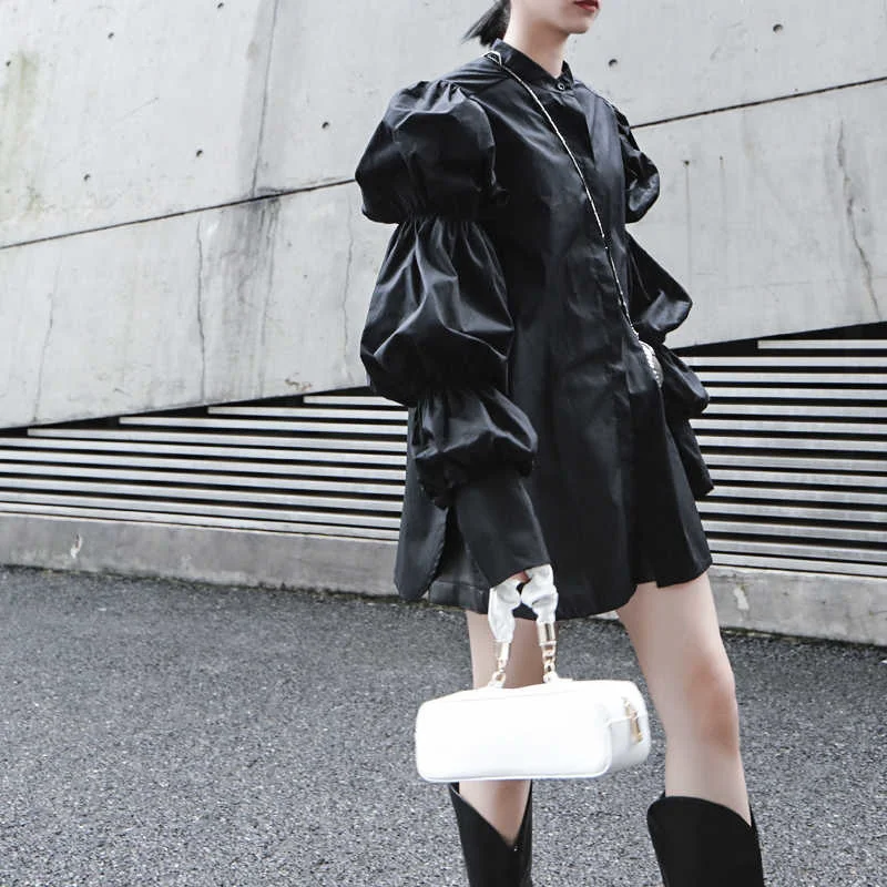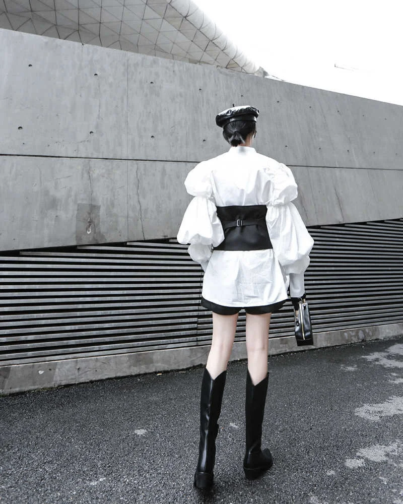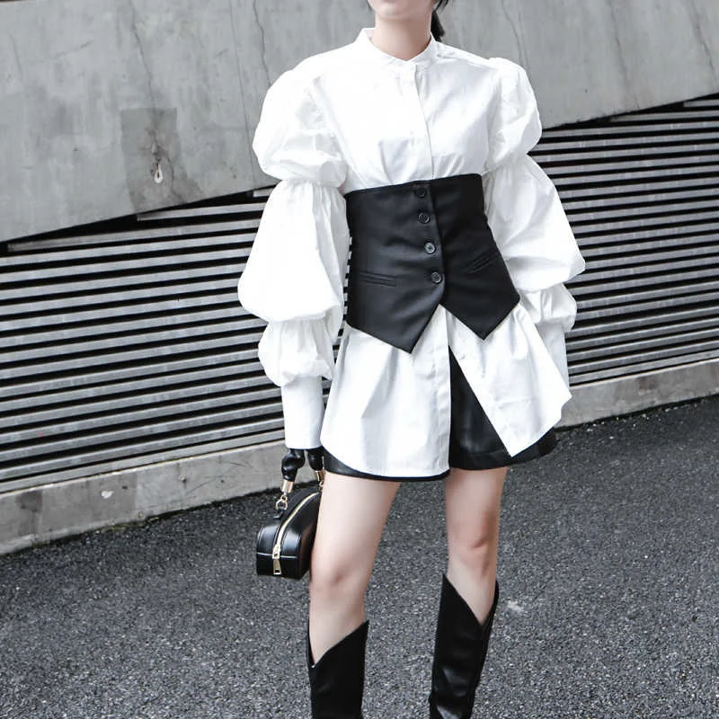 EAM Женская белая плиссированная блуза большого размера с разрезом, новая свободная рубашка с воротником-стойкой и пышными рукавами, модная весенне-осенняя 2022 1K366