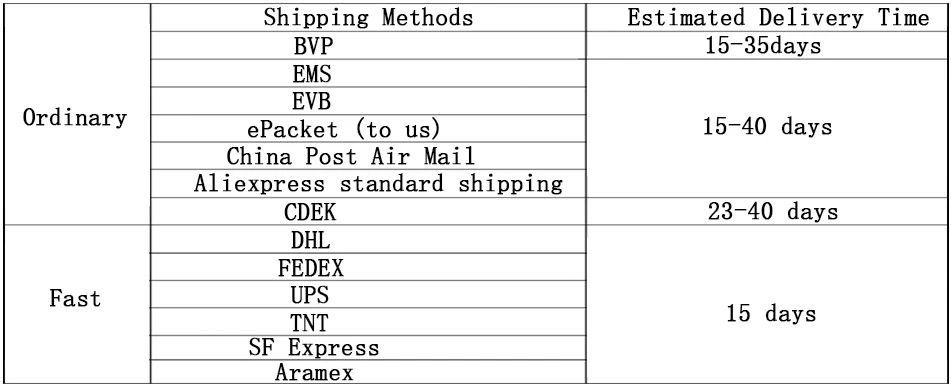 Оплата и налоги -Принимаем paypal , Escrow, кредитные карты, T/T, Western Union, кошелек WebMoney Qiwi и Boleto. -Обратите внимание: стоимость заказа не включает налог на импорт, плату за обслуживание в удаленных районах. -Покупатель несет ответственность за оплату налогов, пожалуйста, осуществите таможенное оформление на местном уровне. Если вам нужен какой-либо документ для оформления, пожалуйста, свяжитесь с нами. -Если ваш город-Удаленный город с DHL/FEDEX/TNT/UPS, DHL/FEDEX/TNT/UPS будет взимать плату за обслуживание в удаленных районах. Доставка -Покупатели из России должны указать свое полное имя, иначе вы можете не получить его из-за почтовой политики. -Для покупателей из Бразилии и Турции, пожалуйста, заранее ознакомьтесь с таможенной политикой. -Для покупателей из Бразилии, Чили, Перу доставка посылка ЛКИ займет 25-60 дней. -Для напряженных дней, в зависимости от сезона, погоды и других факторов, имейте в виду, что время доставки может быть отложено. -Рекомендуем: AliExpress Стандартная доставка Подходит для большинства стран мира. Средний срок доставки 15-35 дней. -Рекомендуем: DHL DHL-это быстро и займет около 3-7 дней для большинства стран, но это может привести к таможенной пошлине. Покупатели несут ответственность за таможенные налоги.
