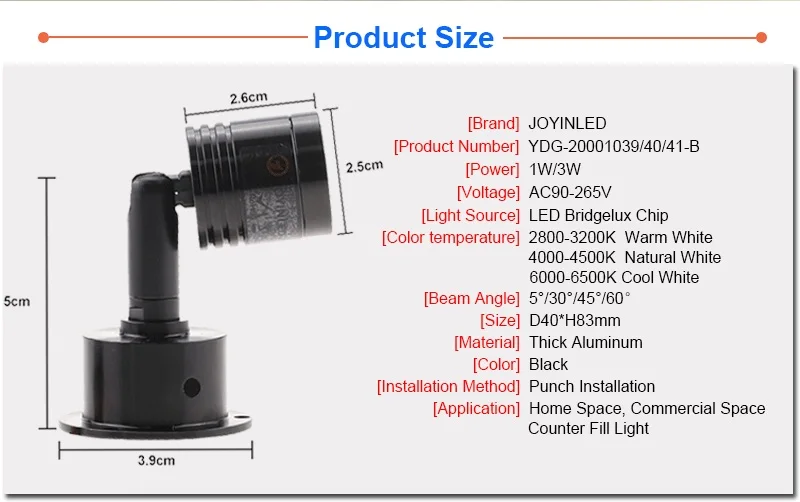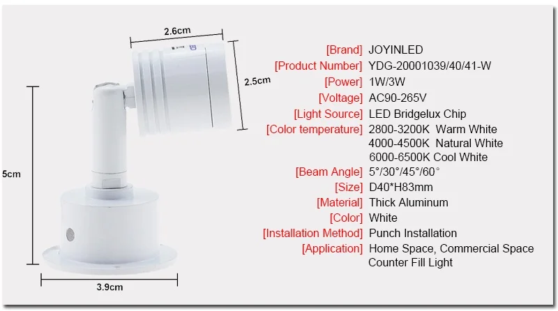 Модель CCT(К) Мощность(Ш) Люмены(Лм) Размеры(Мм) Отверстие для резки(Мм) Высота(Мм) Угол луча Входное напряжение(V) YDG-20001639 3000K 1X3W 180 лм 25 мм Ø38мм 80 мм 45 ° 85 ~ 265 В переменного тока50/60HzDC12V YDG-20001640 4000K 1X3W 180 лм 25 мм Ø38мм 80 мм 45 ° 85 ~ 265 В переменного тока50/60HzDC12V YDG-20001641 6000k 1X3W 180 лм 25 мм Ø38мм 80 мм 45 ° 85 ~ 265 В переменного тока50/60HzDC12VОписание: