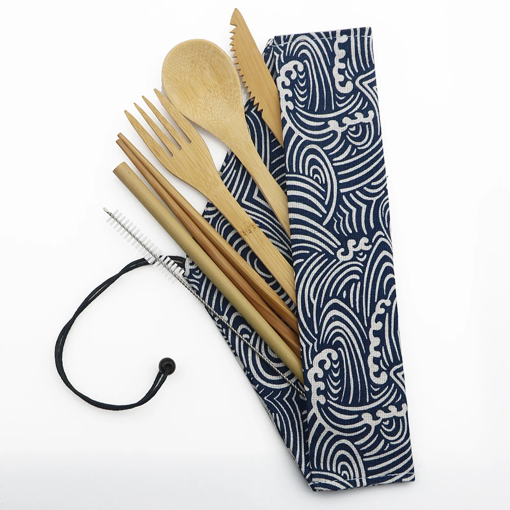 2. Всего 7 штук в наборе, нож + ложка + вилка + палочки для еды + бамбуковая солома + Чистая щетка + мешочек, по 1 шт.