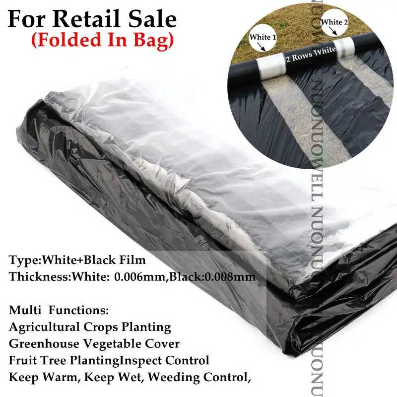 Тип: белая + черная пленка Толщина: 0,006 мм, черный: 0,008 мм Новый материал ПЭ, без запаха Хорошая прочность, хорошая сила растяжения
