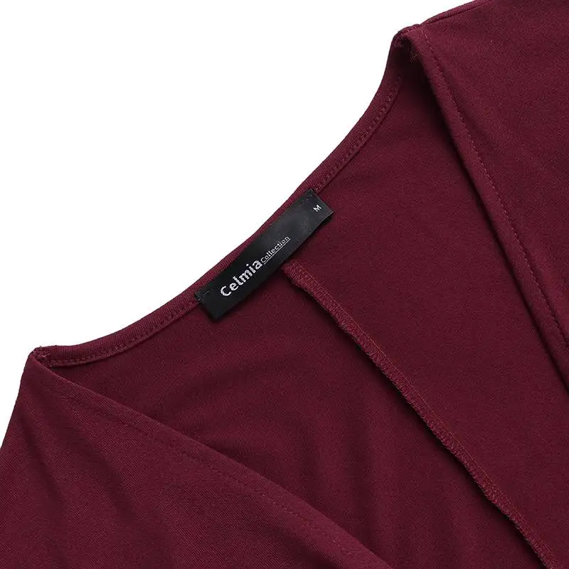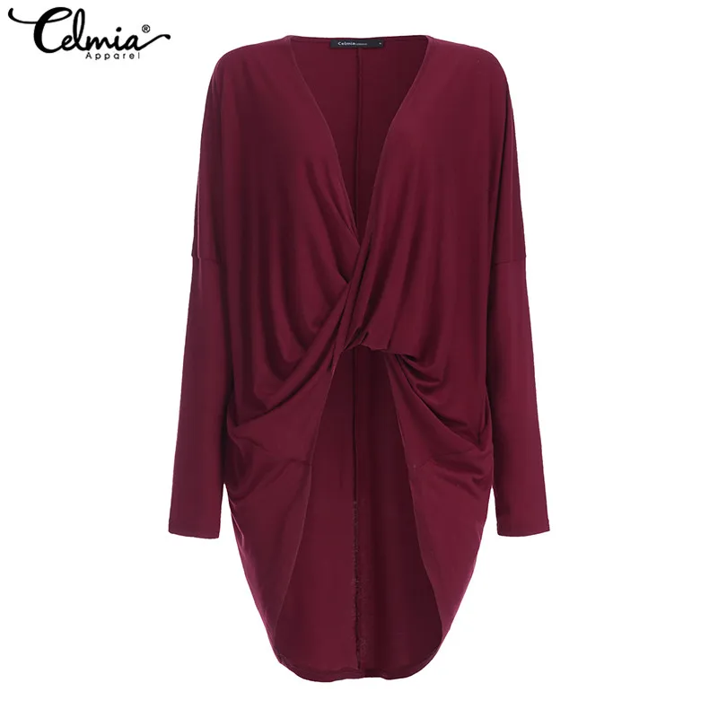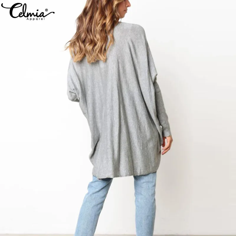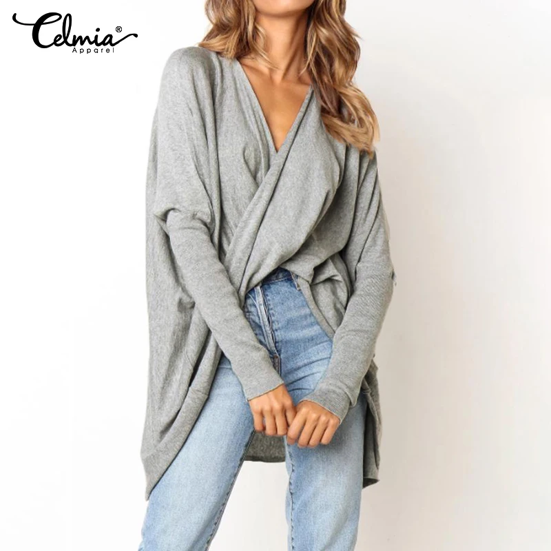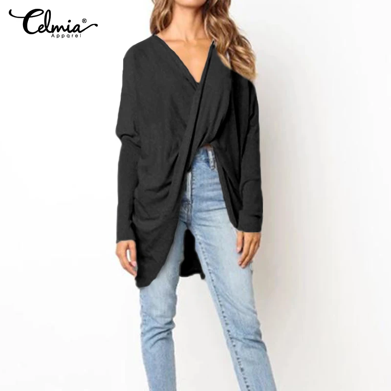 Женские блузки, топы, осенняя блуза с длинными рукавами Celmia 2021 модный вязаный свитер с длинным рукавом, блузка с V образным вырезом асимметричное Плиссированное блузки размера плюс