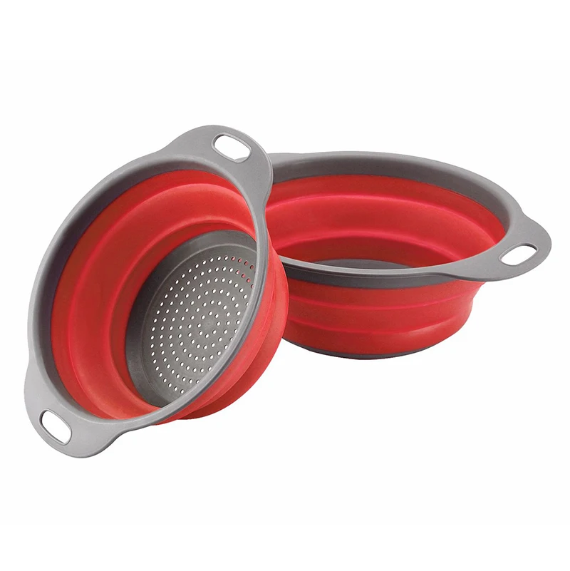 Пищевой силикон, Безопасный в использовании. Складной компактный дизайн, можно сложить и повесить. Обе стороны с ручками, эти ручки удобные, мягкие и прорезиненные. Два предмета дуршлаг включает в себя один комплект, вы можете использовать в качестве разных размеров горшка.