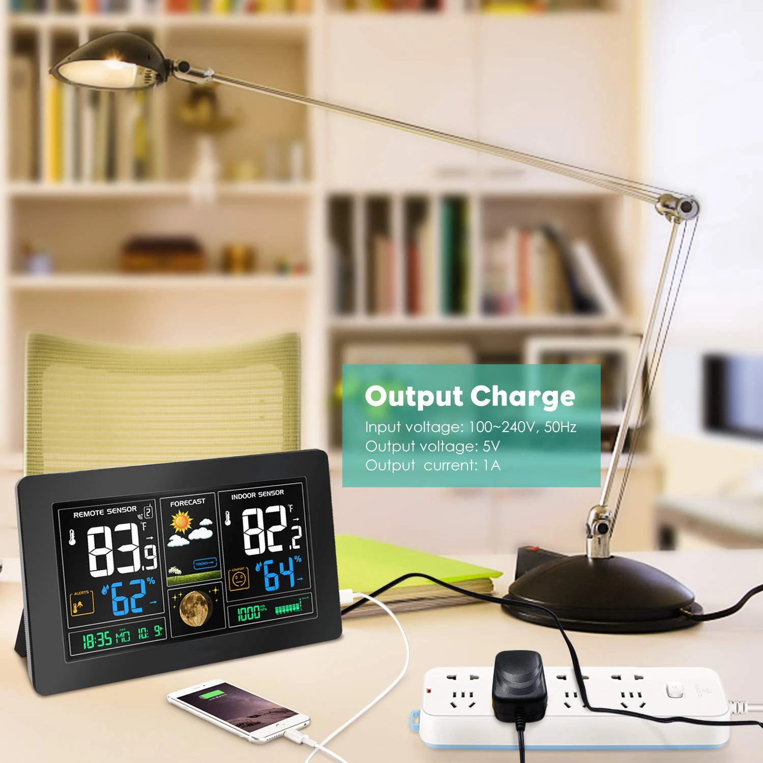 Погодная станция поставляется со встроенным usb-портом для зарядки. Его можно использовать в качестве внешнего аккумулятора для зарядки мобильных телефонов или других устройств при включении настенного адаптера. 2 способа расширения возможностей: адаптер питания переменного тока (входит в комплект) играет главную роль. 2 батарейки LR6 AA (не входят в комплект), чтобы убедиться, что они выдерживают отключение питания.