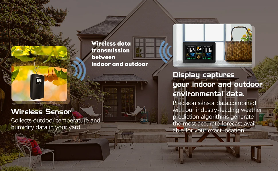 Инновационный наружный беспроводной датчик с наружным дисплеем температуры и влажности, гарантирует самокалибровку и точные данные о условиях наружного применения. Дистанционный Диапазон измерения температуры: -4 °F (-40 °C) ~ 140 °F (60 °C). 200 футов/60 м Открытый передатчик дальность передачи. Будьте готовы ко дню, не выходя из передней двери.