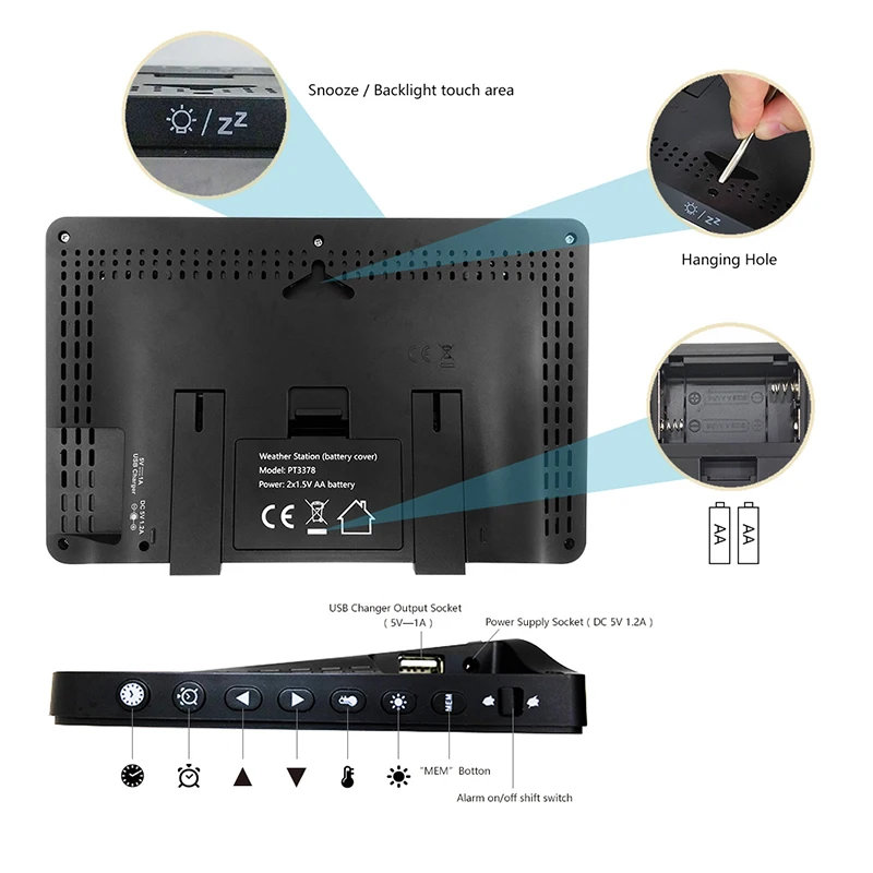 Погодная станция Protmex поставляется со встроенным usb-портом для зарядки. Его можно использовать в качестве внешнего аккумулятора для зарядки мобильных телефонов или других устройств при включении настенного адаптера. 2 способа расширения возможностей: адаптер питания переменного тока (входит в комплект) играет главную роль. 2 батарейки LR6 AA (не входят в комплект), чтобы убедиться, что они выдерживают отключение питания.