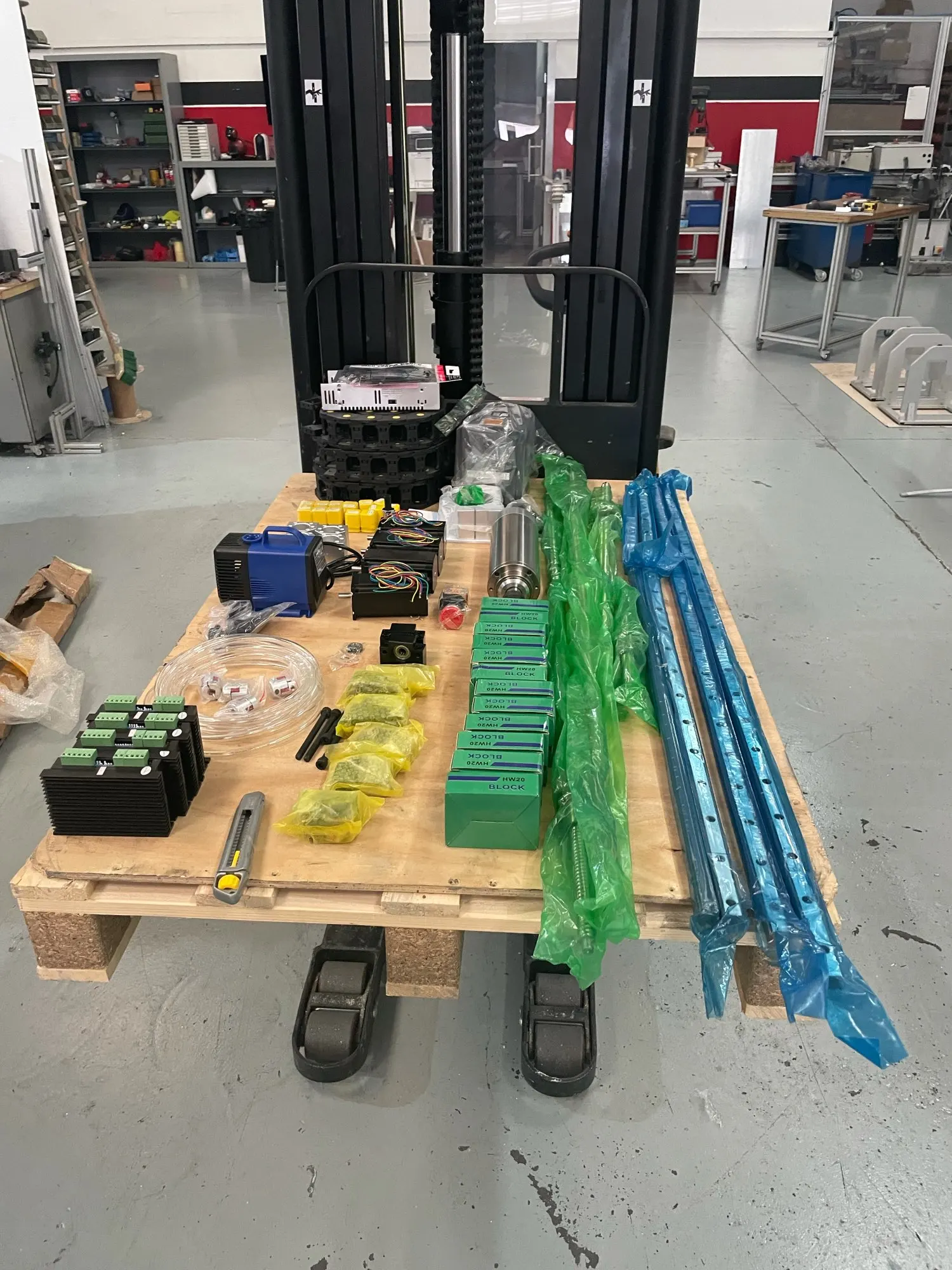 6 линейных рельсов-разной длины для оси X Y Z12 линейных подшипников3/4 набор шариковых винтов с гайкой, опоры, Корпус гайки, муфты1 комплект шаговых двигателей для 3 осей1 комплект шпинделя воздушного охлаждения/водяного охлаждения3 шт. кабельная цепь 25*38-1000 мм высокого качестваКонцевые выключатели 3 шт.1 шт. E-stop