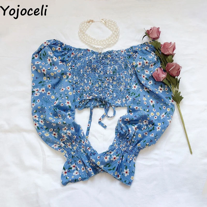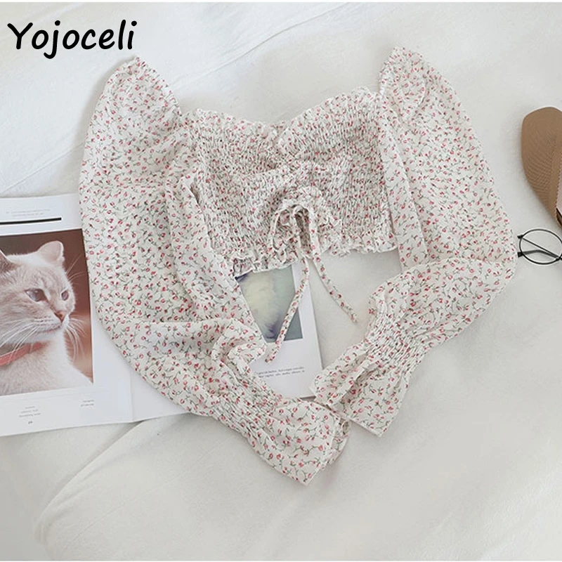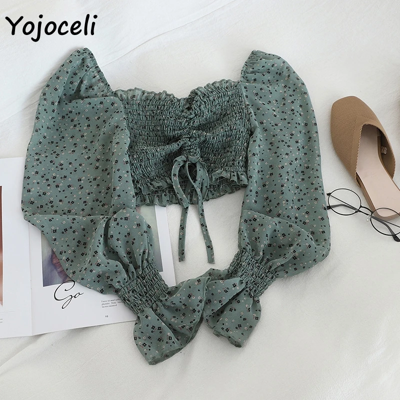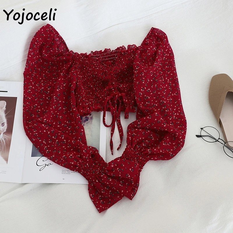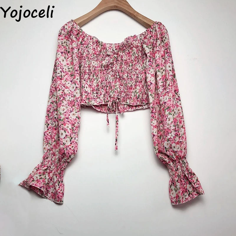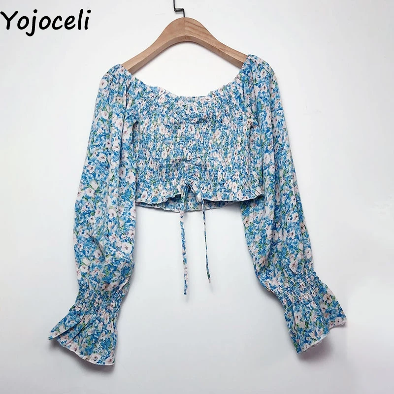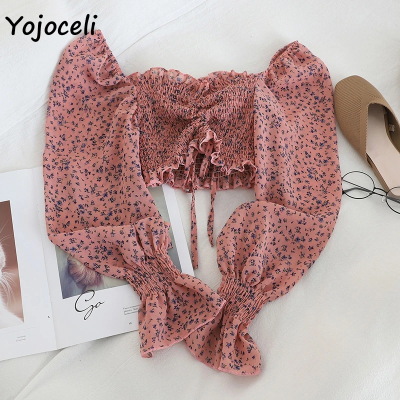 Пляжная блузка Yojoceli с принтом в стиле бохо, женская короткая блузка с длинным рукавом и рюшами, топы, женские блузы