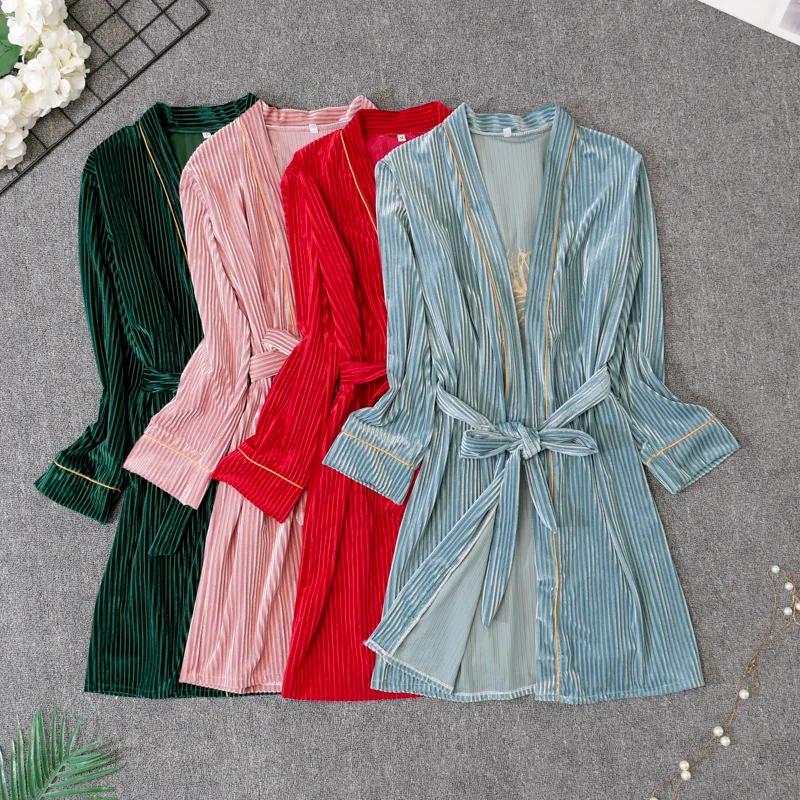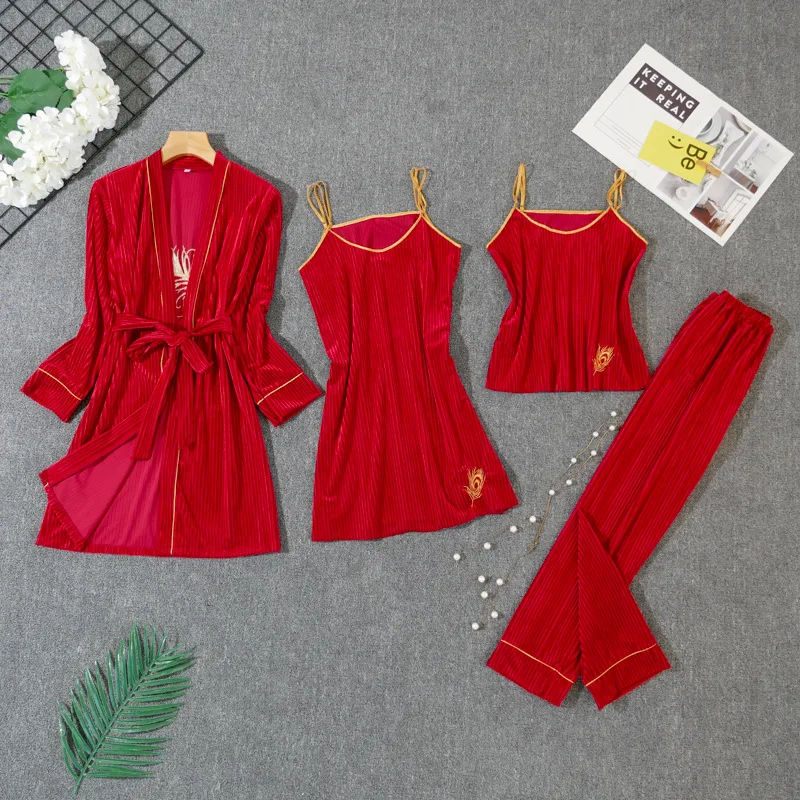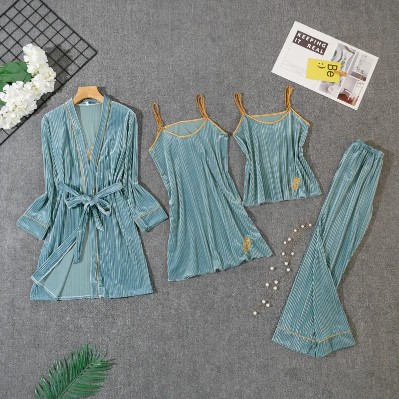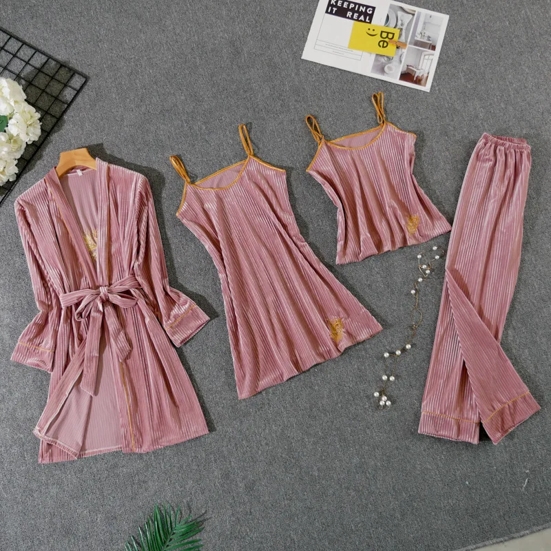Пижамный комплект Женский, из 4 предметов, бархатный, с кружевом и поясом