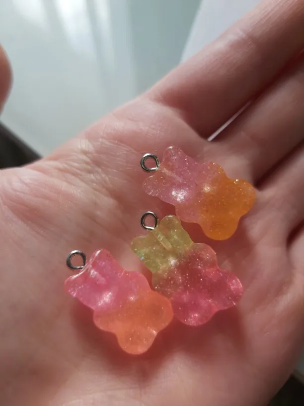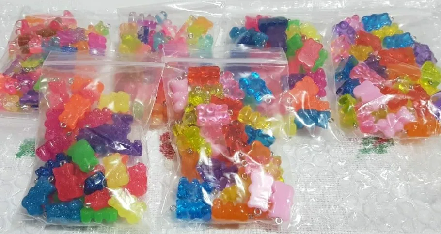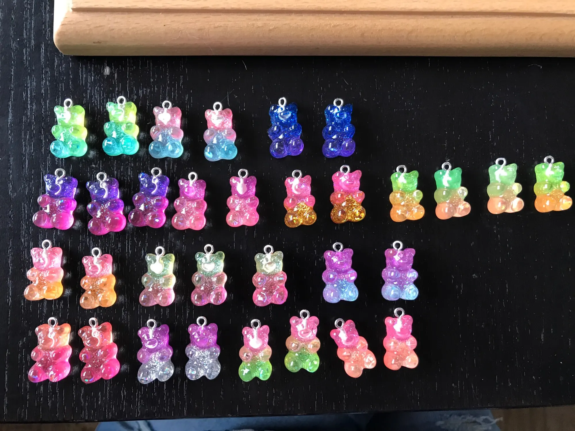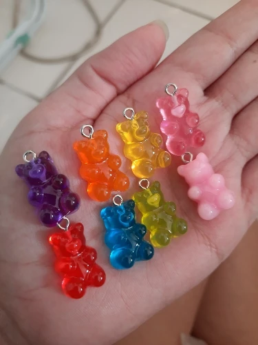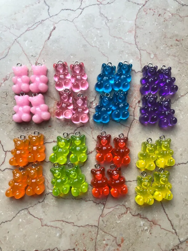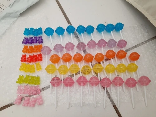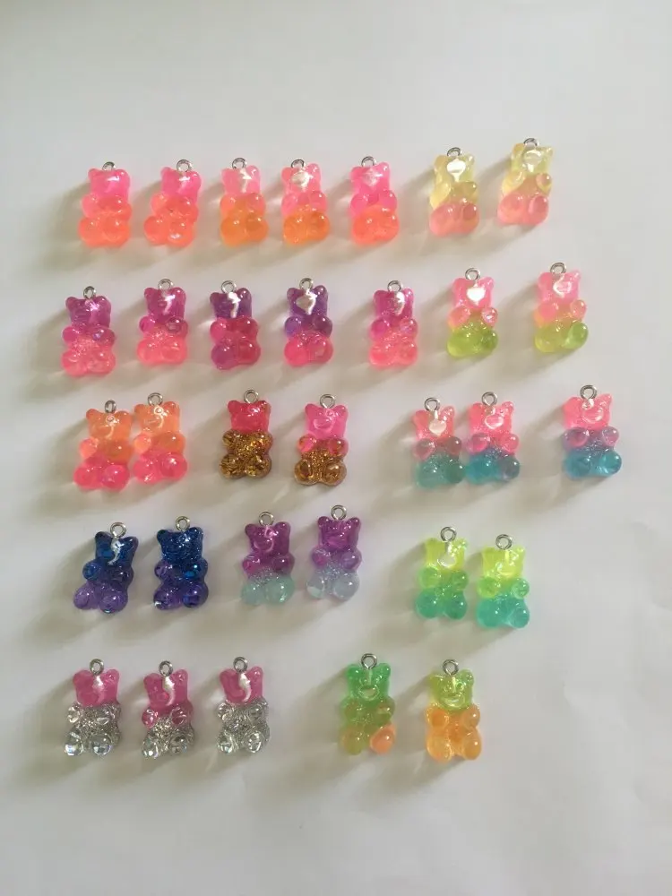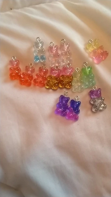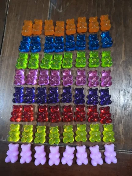 Есть 9 / 10 цветовых комбинаций. Цвета иногда переворачиваются. Металлический штифт иногда очень заметен, особенно с задней стороны. Есть все 32 шт. Они не тяжелые, довольно легкие, подходят для сережек. Размер настоящих мишек Гамми.