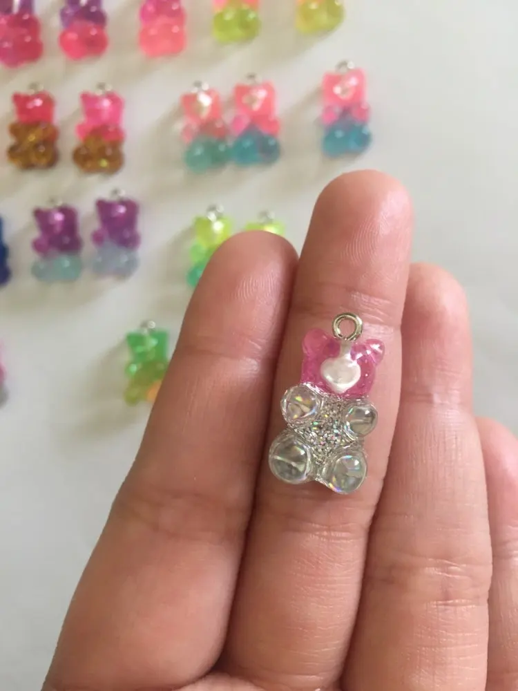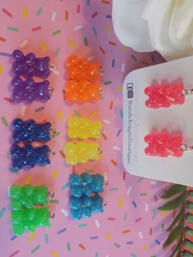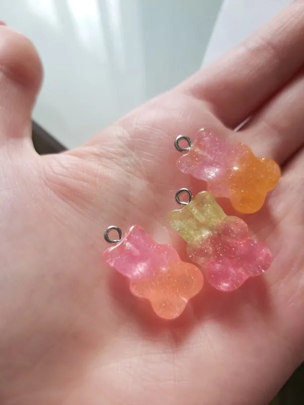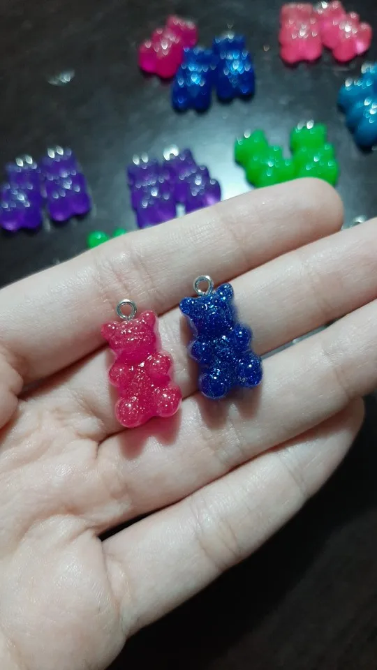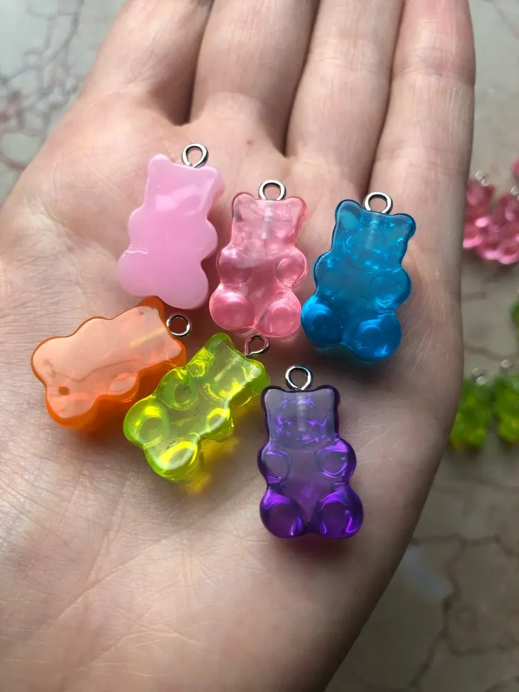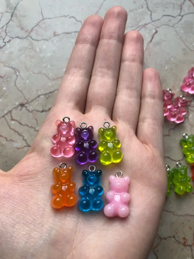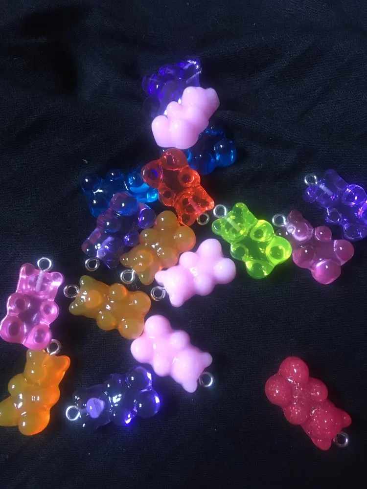 Есть 9 / 10 цветовых комбинаций. Цвета иногда переворачиваются. Металлический штифт иногда очень заметен, особенно с задней стороны. Есть все 32 шт. Они не тяжелые, довольно легкие, подходят для сережек. Размер настоящих мишек Гамми.