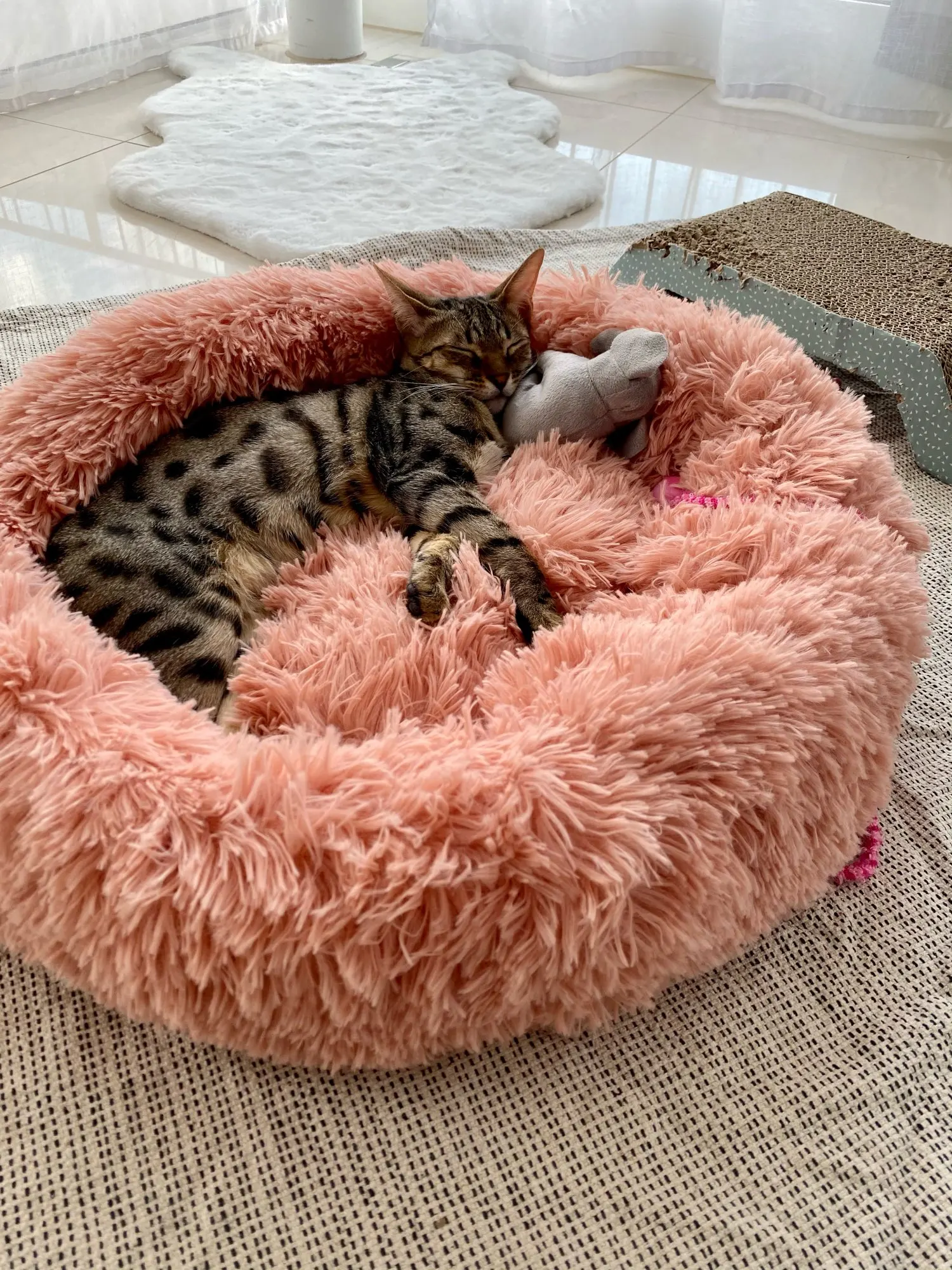 Особенности:Изготовлен из длинного плюша, очень мягкий и очень теплый.Удобный на ощупь, длина 3 см, плюшевая повязка для волос, домашние животные любят спать на нем.Чистый цвет с милым дизайном, это красивая кровать.Портативный и легкий.Легко чистить и мыть.Нетоксичный материал без запаха, домашние животные легко приспособятся к нему.Характеристики:Материал: Длинный плюшЦвета: Розовый, серый, бежевыйРазмеры: S Диаметр 40 смМ диаметр 50 смL Диаметр 60 смXlдиаметр 70 см