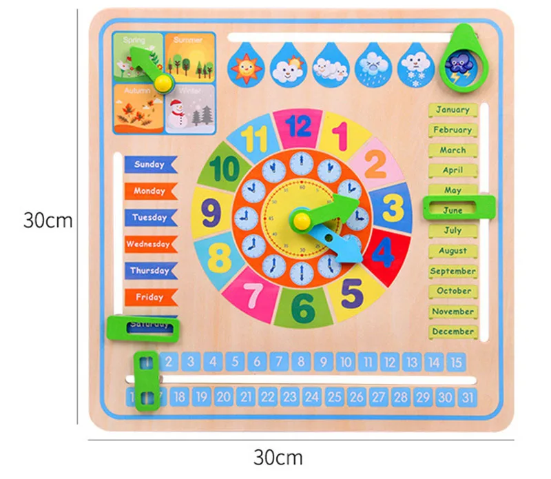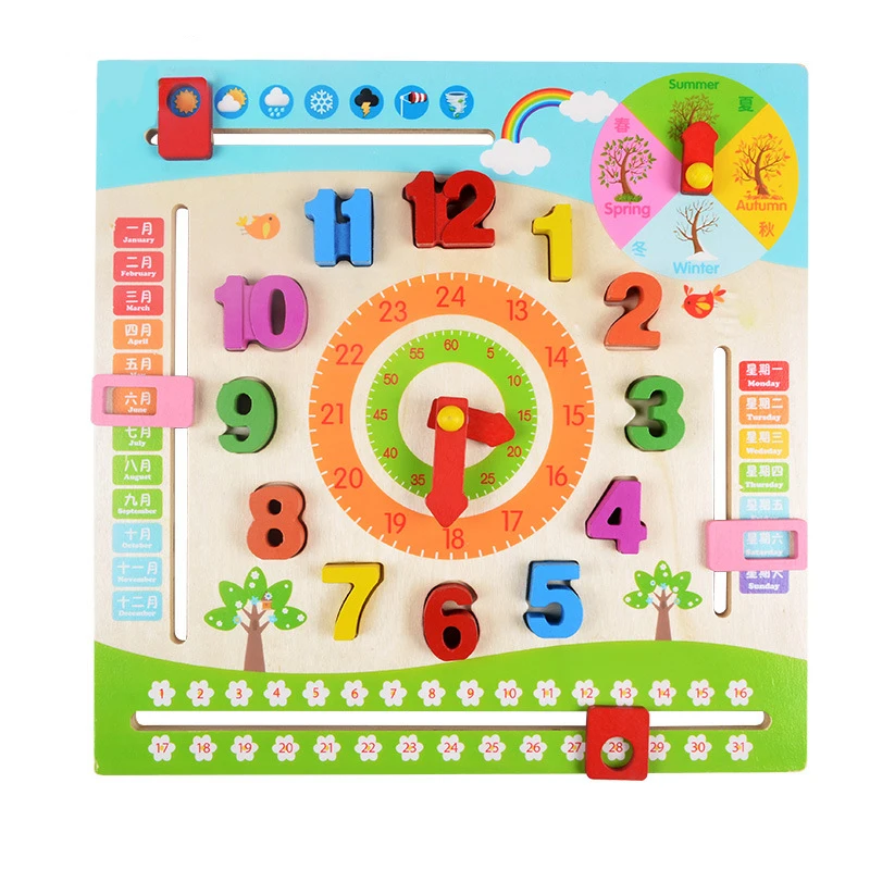 Название продукта: многофункциональные часы-календарь Возрастной диапазон: для детей от 3-х лет Материал: высококачественное дерево описание изделия супер-Рекомендуемая продавцом игрушка-часы, превосходный дизайн, не только познавательные часы, но также сезон, месяц, погода и так далее. Особенности 1. Сезон 2. Месяц и неделя 3. Утро, вечер 4. Часы 5. Погода