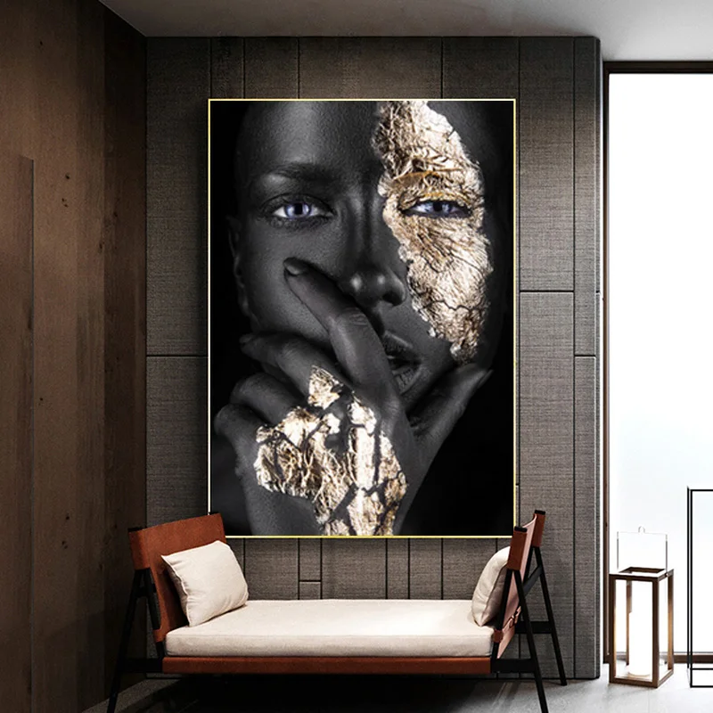 Африканская черная и Золотая Картина на холсте «женщина» куадро плакаты-портреты и принты скандинавские настенные художественные картинки для гостиной