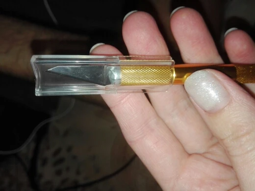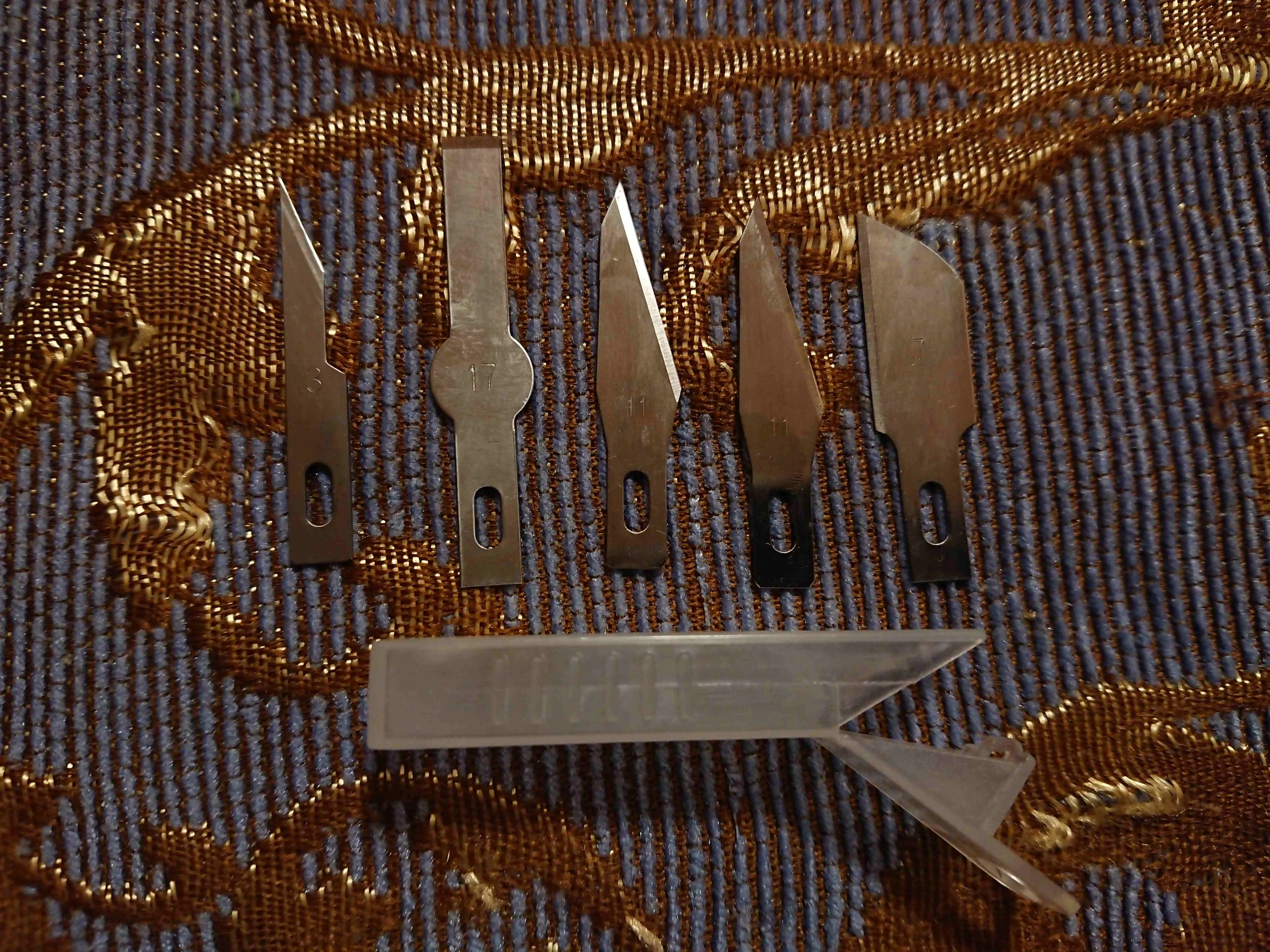 хороший скальпель. лезвия разнообразные идут в коробке, на самом скальпеле защитный колпачек