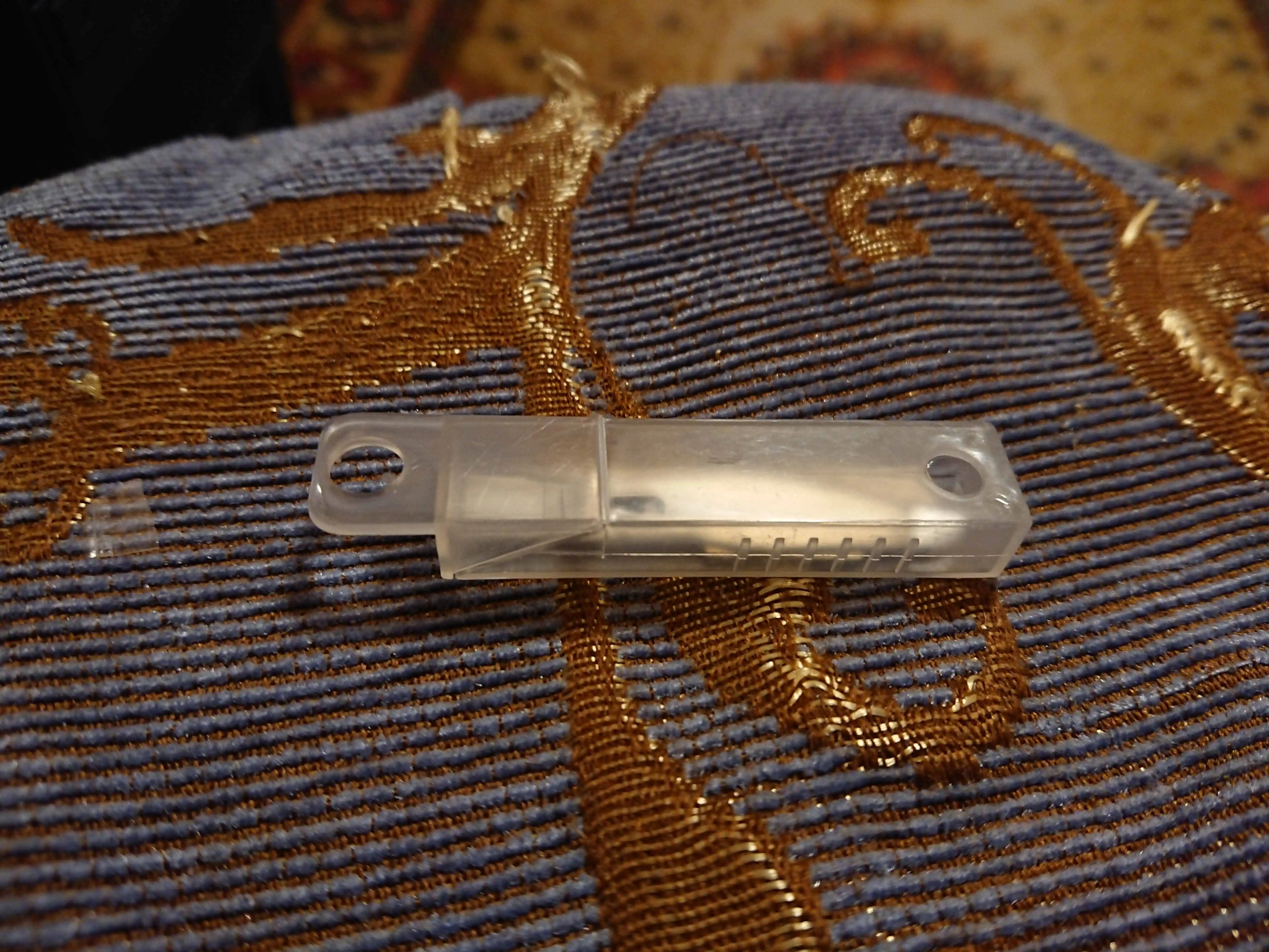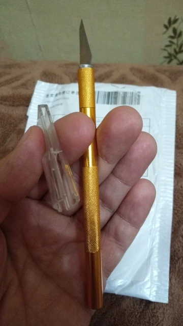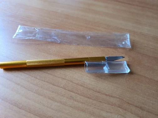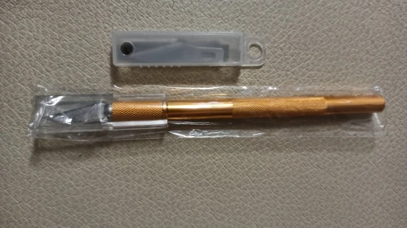 Хороший скальпель. Резал только бумагу и оплетку, режет отлично. Держится только сжатием, никаких выпуклостей, для удержания лезвия на месте, нет. Толщина лезвия около 0.5 мм, гнется слабо, поэтому можно сломать. Доставили в Украину Укрпочтой за 30 дней.