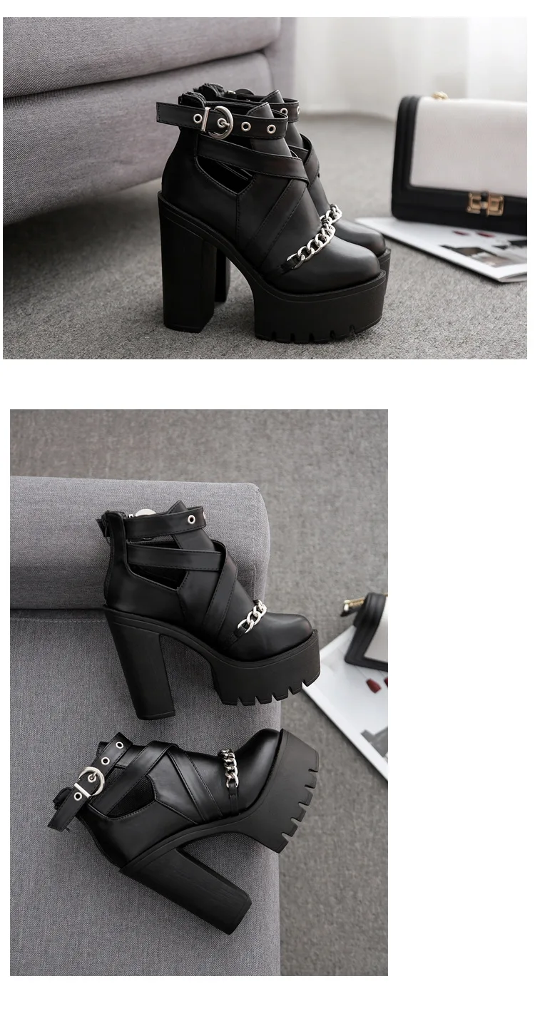 Женские ботильоны на платформе и толстом каблуке, повседневные ботинки с вырезами, пряжкой и круглым носком, с цепочкой, весна-осень 345