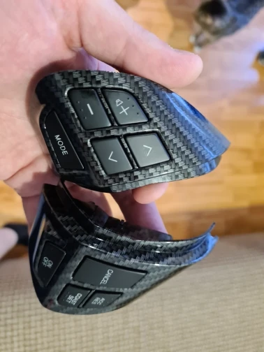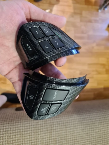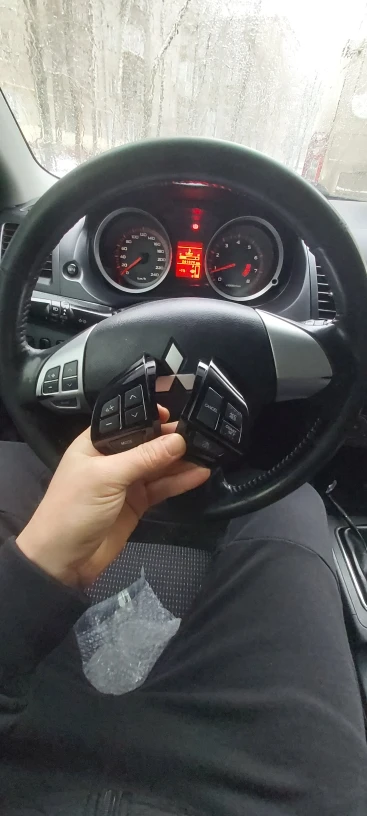 Выглядят отлично, Качество рисунка карбонового покрытия -тоже хорошее. (но это не карбон) Встали на руль без проблем, все кнопки работают. Нажимаются мягко. В комплекте был провод, но он не понадобился, так как в Максимальной комплектации Lancer X уже есть вся проводка. Товар доехал до Сибири за 12 дней.