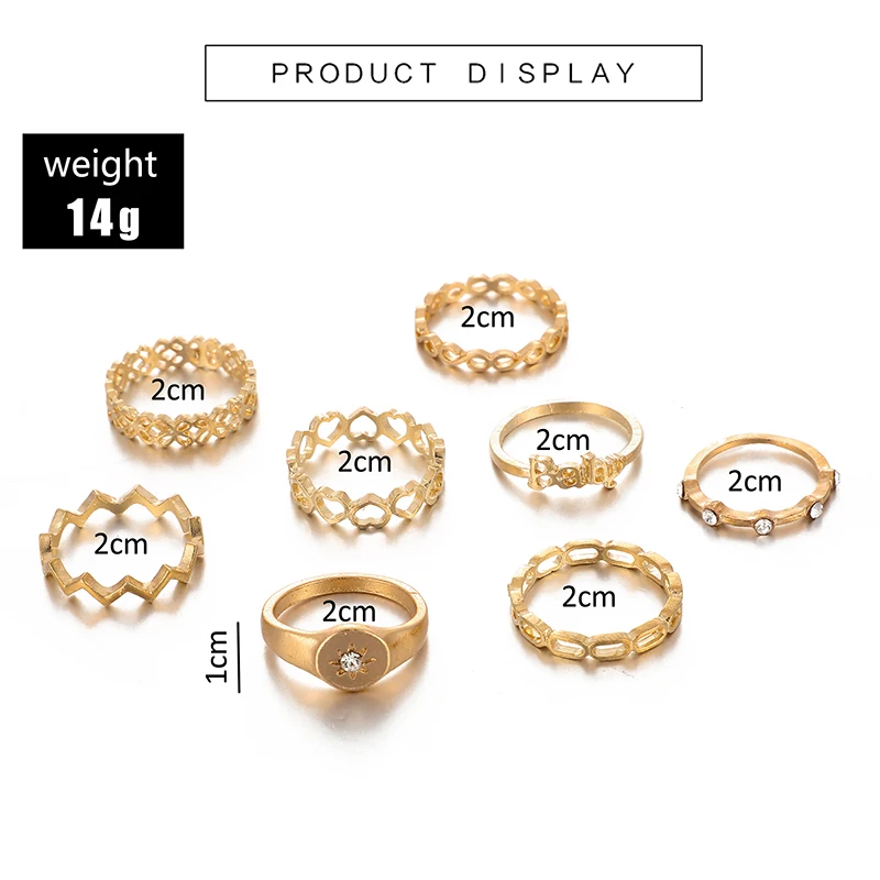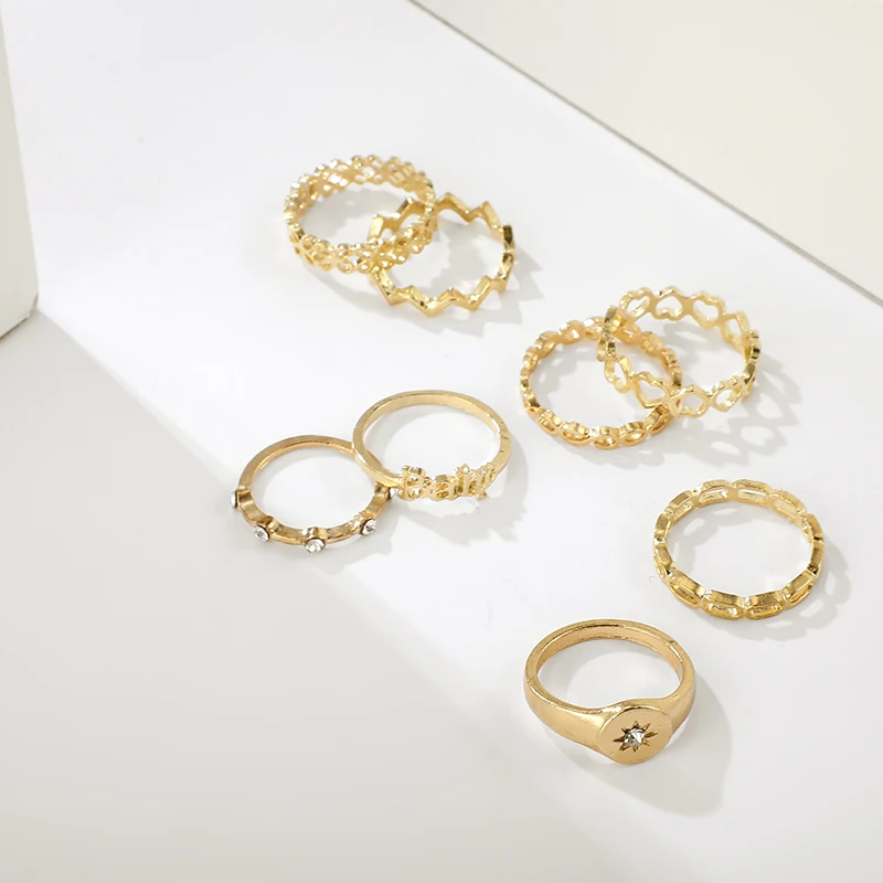 Docona 8 шт.компл. женские модные кольца для женщин винтажные буквы детские сердца цветы кристаллы геометрические золотые кольца набор 9087