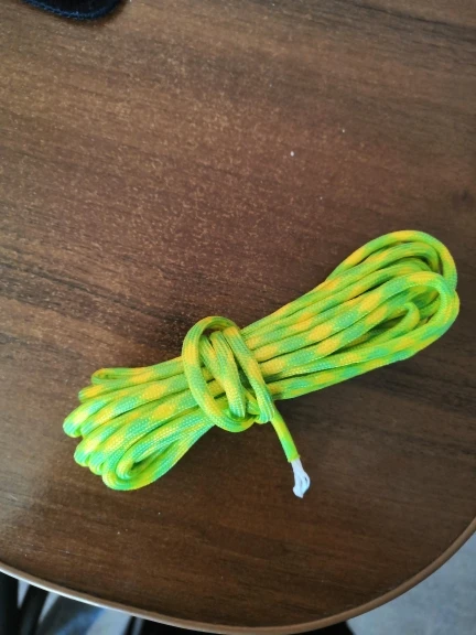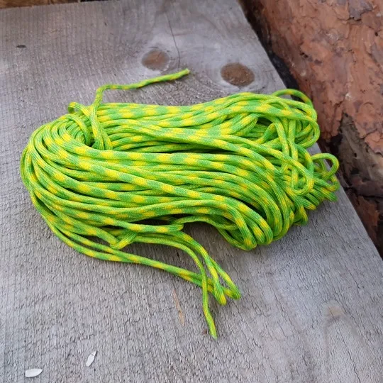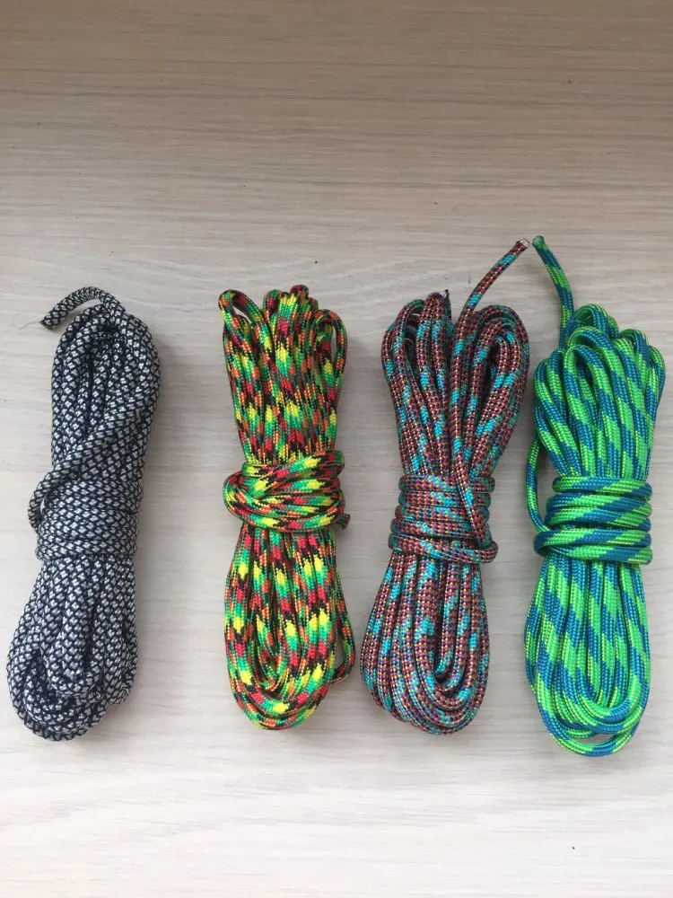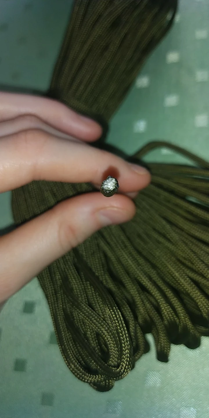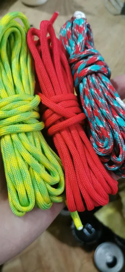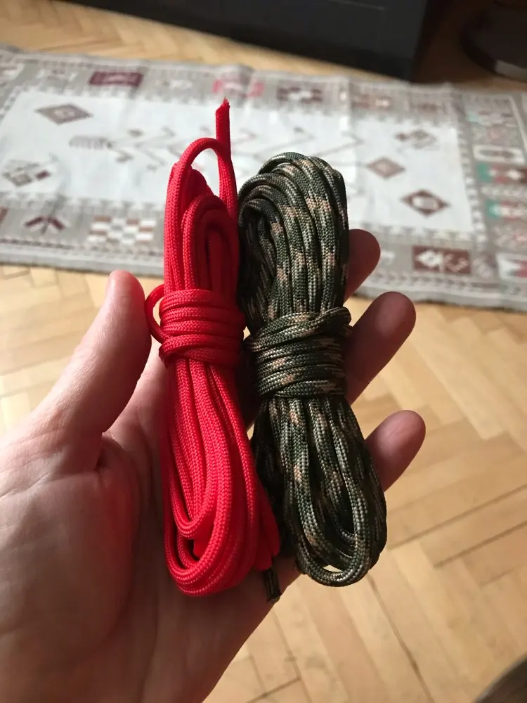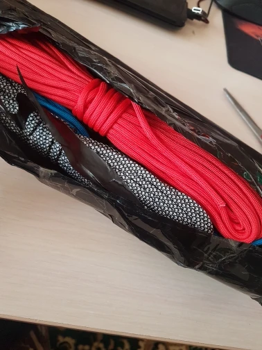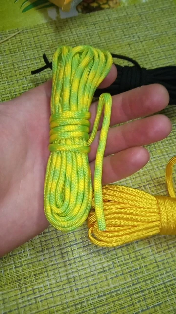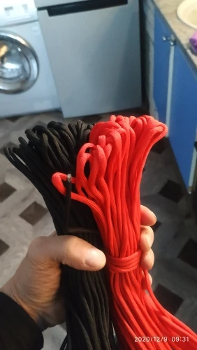 Заказал в двух цветах (на фото), по 5 м каждого. Товар шёл долго, больше 2-х месяцев, на территории России трек не отслеживался. С продавцом не связывался - без надобности. Один моток пришёл 4,84 м, второй - 4,90 м. Оплётка, на мой взгляд, слабовата (пушится местами и торчат пряди) и недостаточно плотно облегает внутренние жилы. Внутри 9 переплетённых жил, как в описании. Цвет порадовал: насыщенный, ровный, зелёный шнур даже со светоотражающим эффектом. На нагрузку на проверял, но субъективно доверять ему что-то очень ответственное я бы не стал, тут лучше подстраховаться. Для плетения браслетов, аксессуаров, для использования для бытовых нужд, не экстремальных, вполне подойдёт, как по цене, так и по внешнему виду. Хотя сделать навес, поставить палатку, примотать что-нибудь, думаю, шнуры справятся.