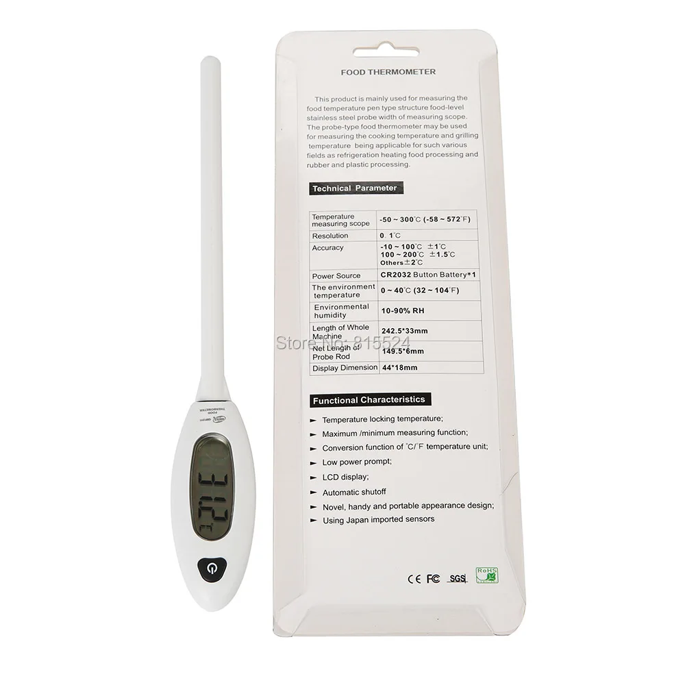 1. ЖК-дисплей 2. Температурный замок 3. Макс./Мин измерения 4. Преобразование между градусами Цельсия и по Фаренгейту 5. Автоматическое отключение питания 6. Питание от 1 батарейки CR2032 7. Используется для измерения температуры приготовления пищи, температуры гриля, пищевой промышленности и т. Д.