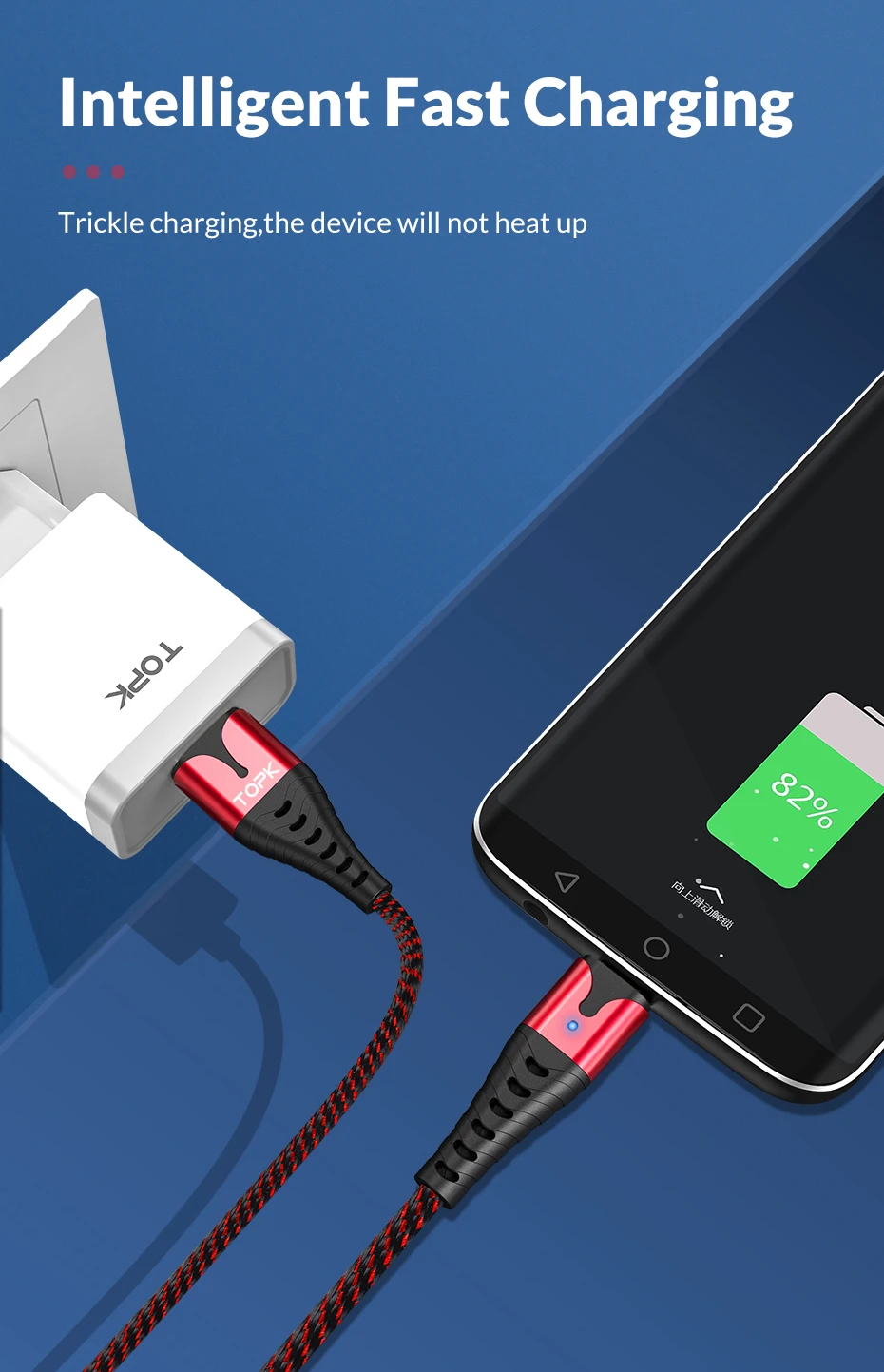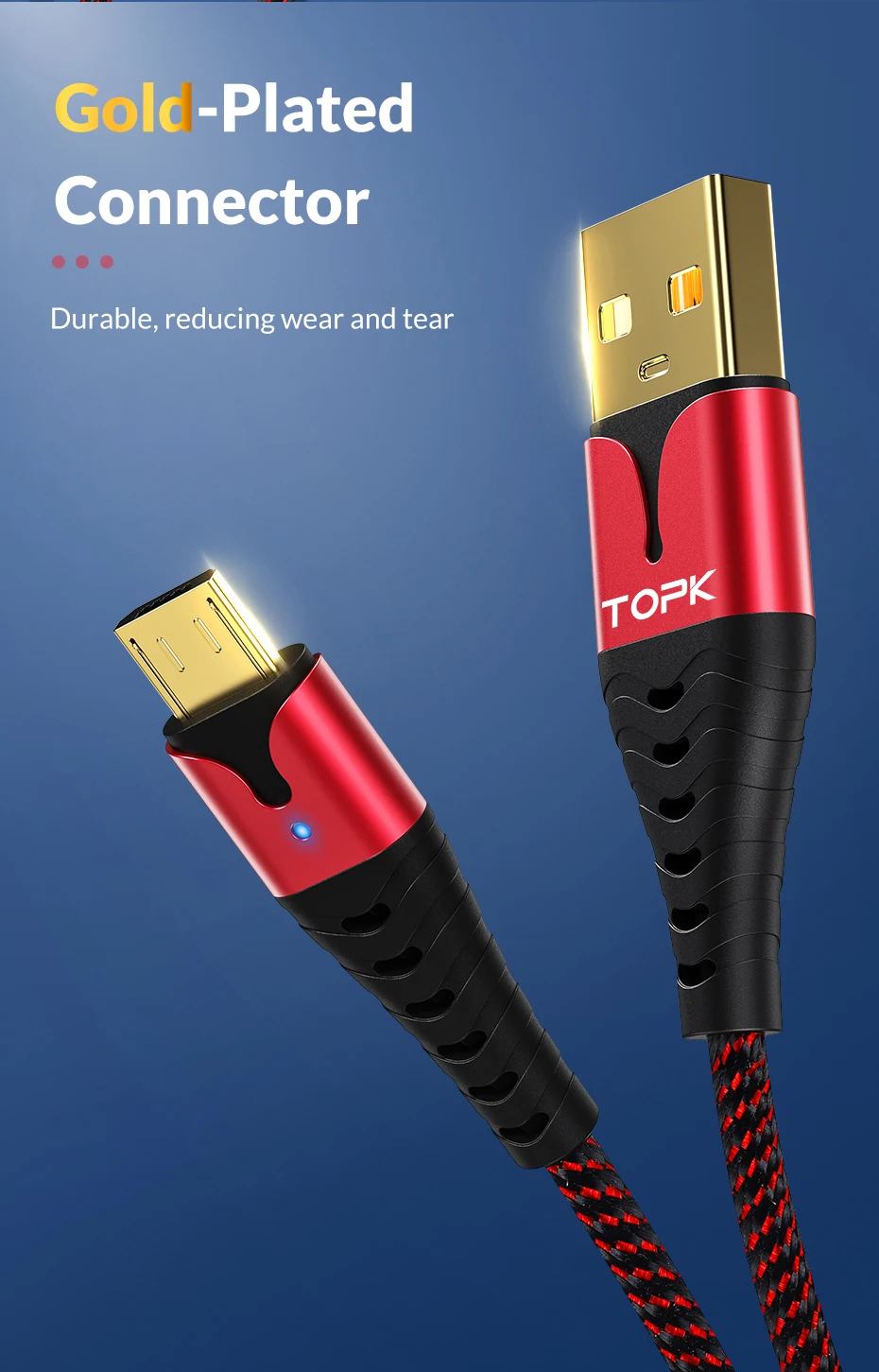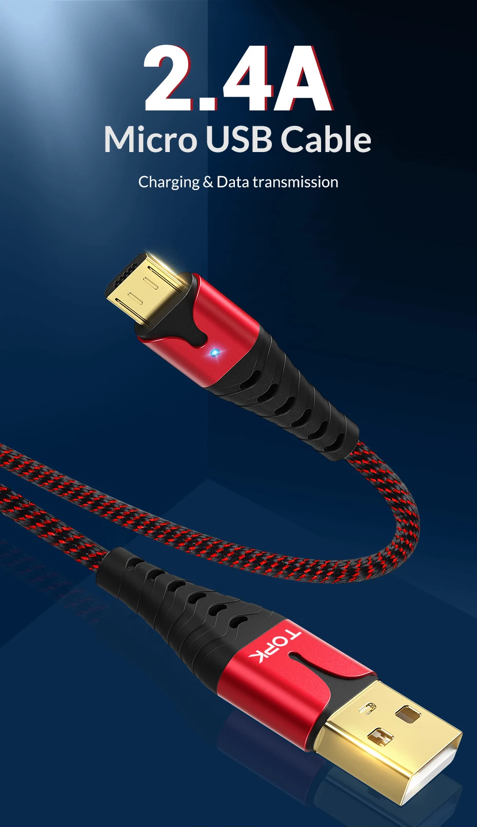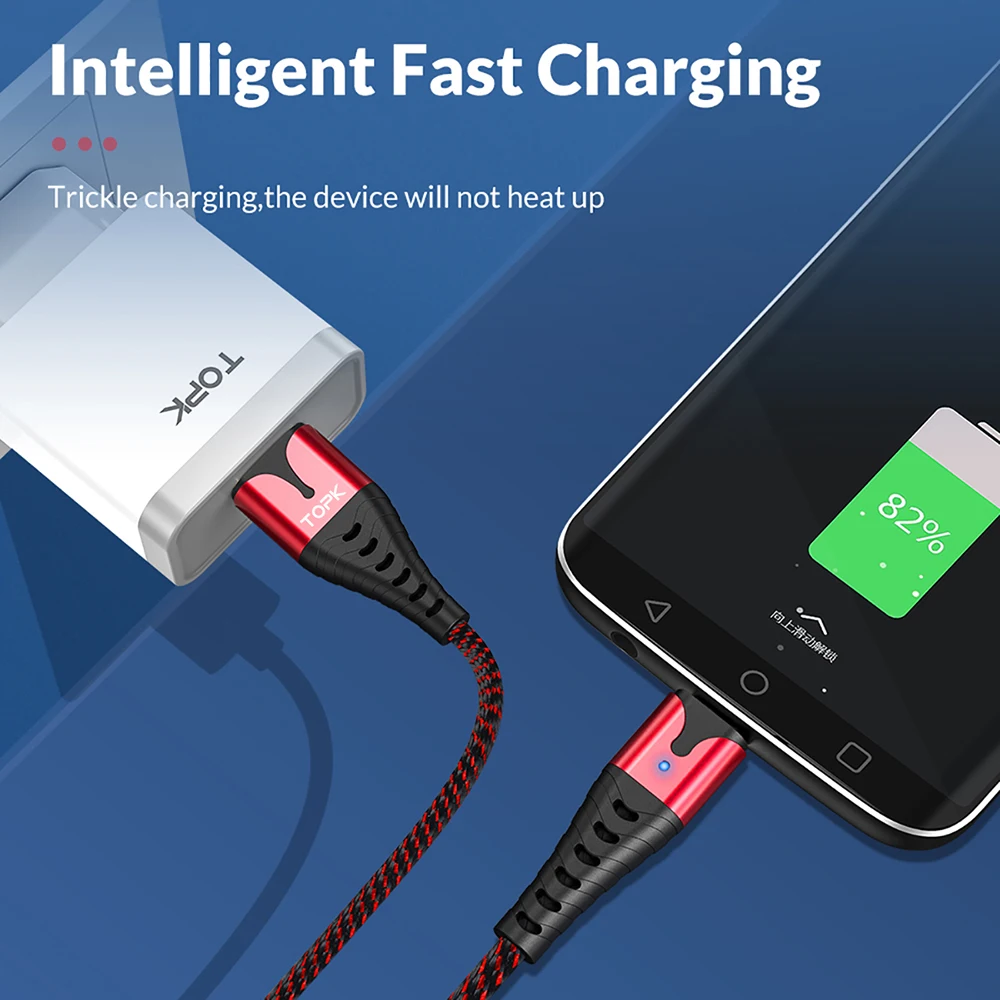 Кабель Micro USB TOPK светодиодный 1 м для быстрой зарядки Xiaomi Samsung Huawei Android мобильный телефон