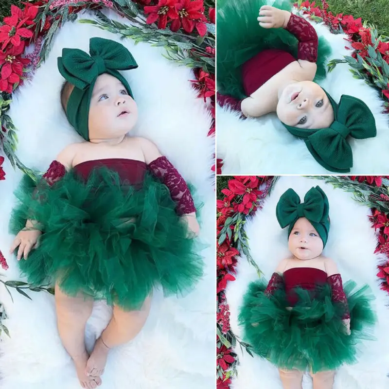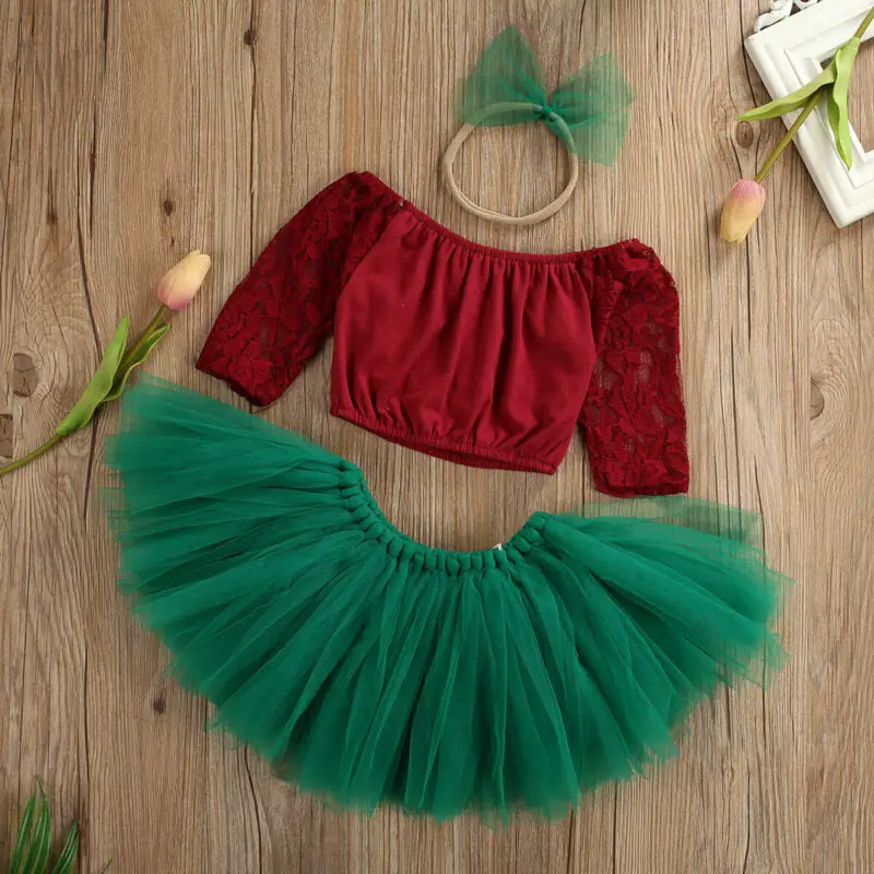 Комплекты рождественской одежды для новорожденных девочек топ с открытыми плечами + кружевная юбка-пачка повязка на голову, комплект из 3 предметов для рождественской вечеринки