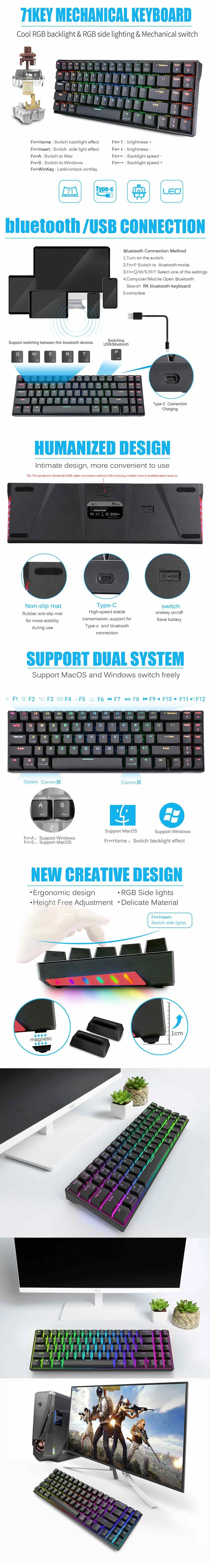 Механическая игровая клавиатура Royal Kludge RK71, 71-клавишная Bluetooth-совместимая Беспроводная USB Двухрежимная RGB-подсветка, синий, коричневый, красный переключатель