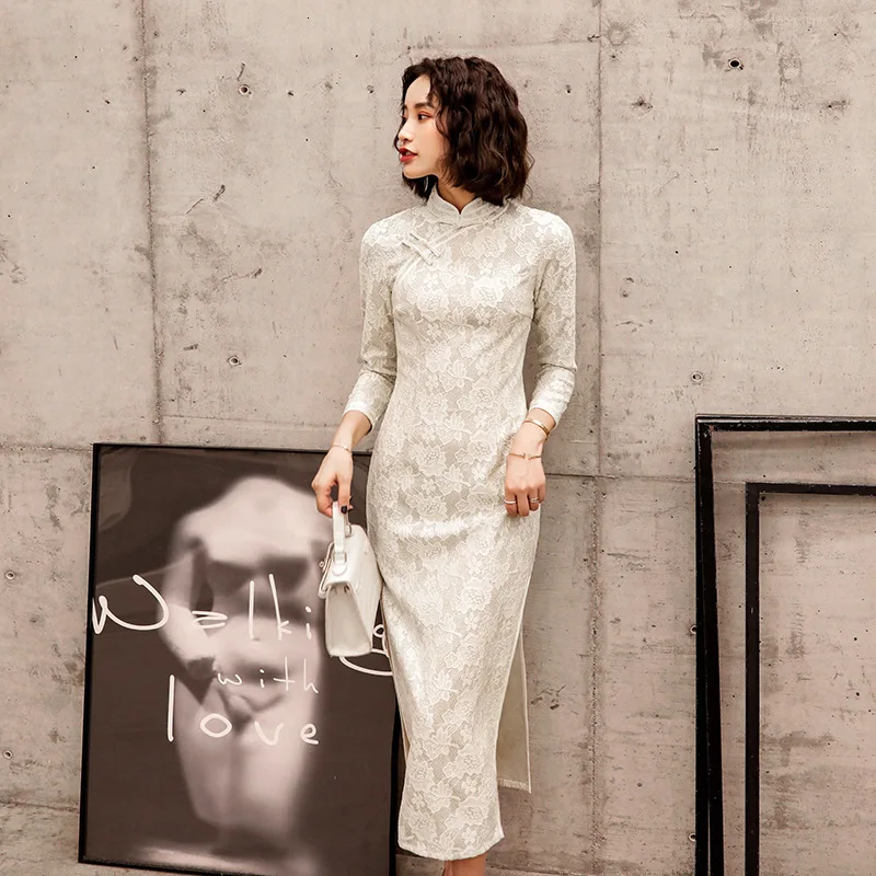 Белые кружевные платья Чонсам Sheng Coco, одежда для тостов, платья для встреч с длинными рукавами, китайские свадебные кружевные платья чонсам