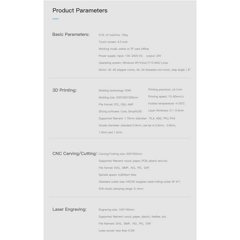 Принцип формования плавленого формования (FDM) Размер формовочной платформы для 3d-печати: 200 × 200 × 200 мм, гравировка/резка с ЧПУ: 200 × 200 мм, лазерная гравировка: 100 × 190 мм Точность печати ± 0,1 мм Толщина слоя 0,1-0,4 мм Диаметр сопла 0,4 мм (0,6 мм, 0,8 мм, 1,0 мм, 1,2 мм опционально) Скорость печати 10-80 мм/сек. Программные требования Случайное программное обеспечение Cura, Simplify3D Формат печати данных STL, OBJ, AMF Операционная система Windows XP/Vista/7/10, MAC, Linux Расходные характеристики Полиграфические материалы, пла, АБС, ТПУ, ПВА Физических параметров Рабочая температура пола ≤ 100 °C Входная мощность: 100-240 в перем. Тока, Выходная мощность: 24 В