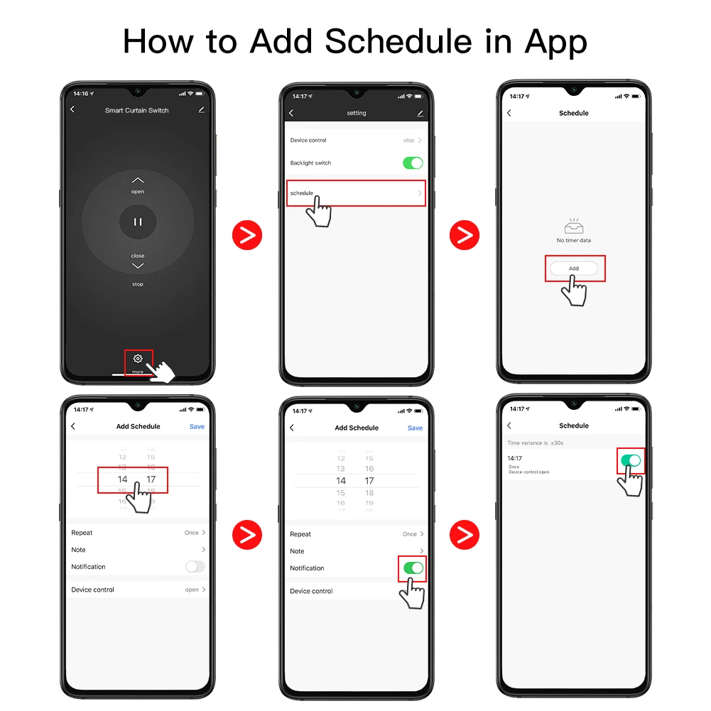 5. Расписания иПротивовес:Установите расписание, чтобы контролировать шторы по своему собственному расписанию. Автоматически Откройте занавеску, когда вы поднимаетесь и закрываете занавеску, когда ложитесь спать. Когда вы вздремнете, установите противоположную сторону, чтобы открыть шторы, чтобы разбудить вас.