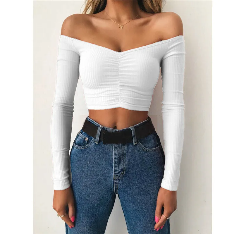 Корсет с длинным рукавом, футболка с открытыми плечами, женский сексуальный Повседневный осенний пуловер, укороченный топ, базовая футболка, облегающие Джерси Топы