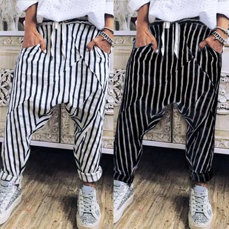 Материал: 95% полиэстер + 5% спандексЦвет: черный, белыйПосылка входит: 1 штаныДетали продукта:-Эластичный пояс-Шнуровка-Простой и удобный-Брюки в полоску-Боковые карманы