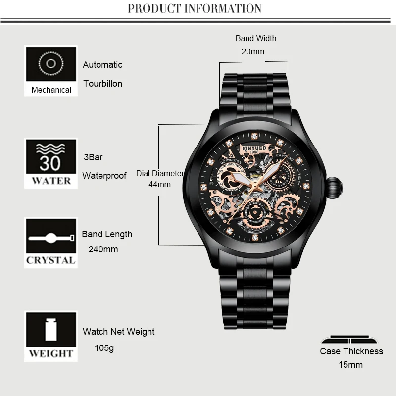 Часы-скелетоны KINYUED Мужские механические, черные стальные автоматические светящиеся водонепроницаемые наручные, с турбийоном
