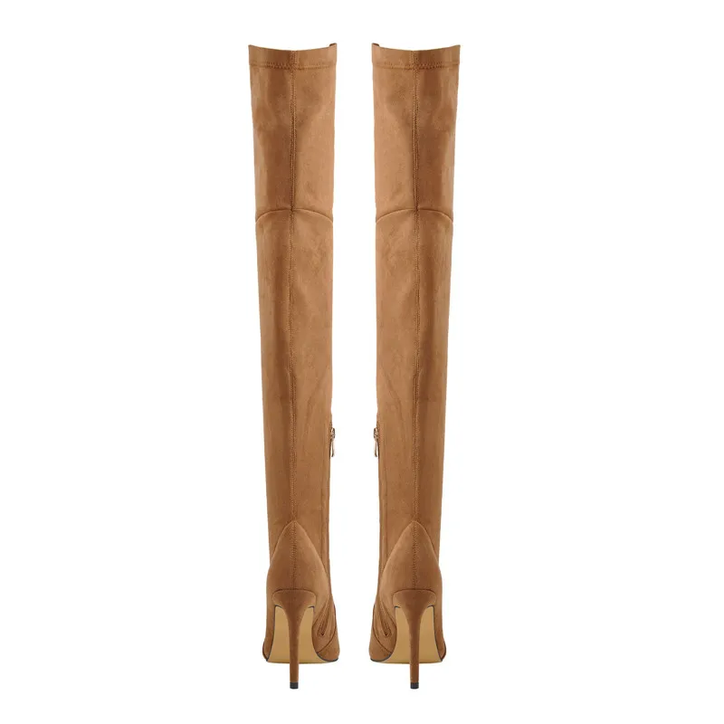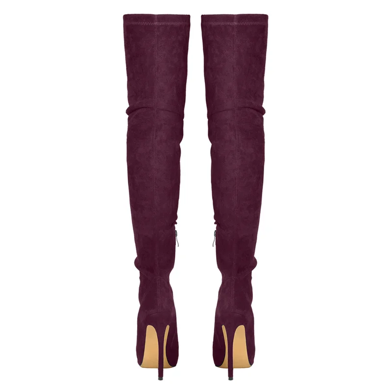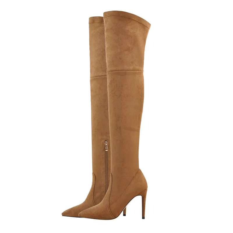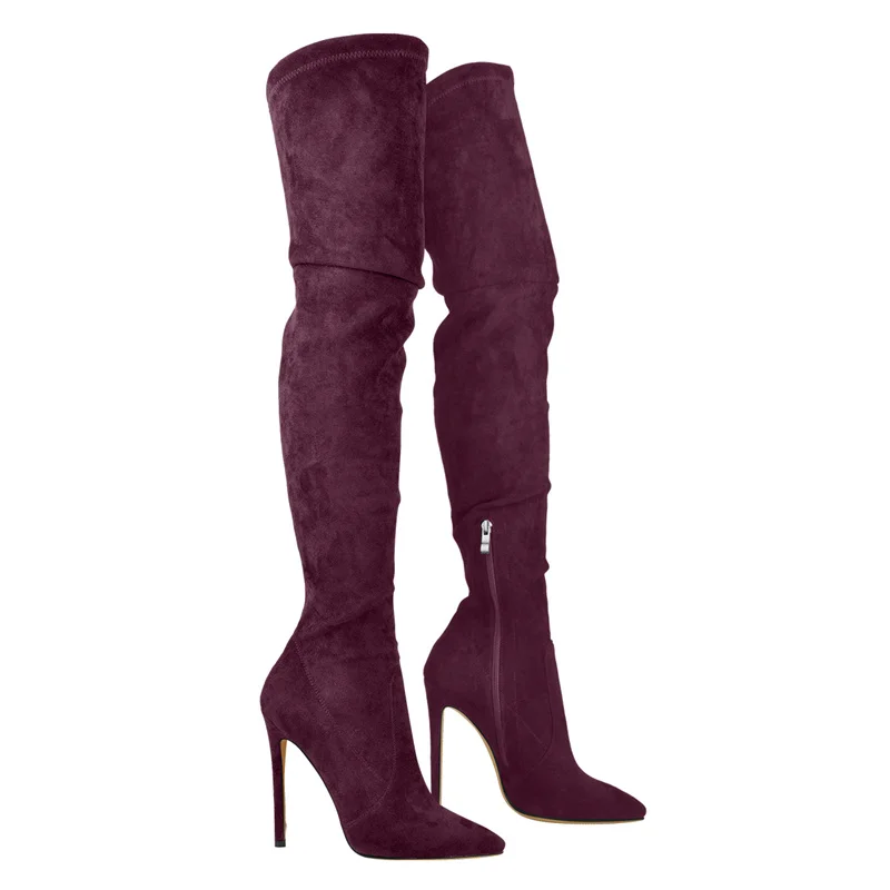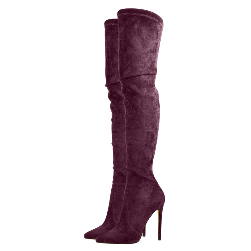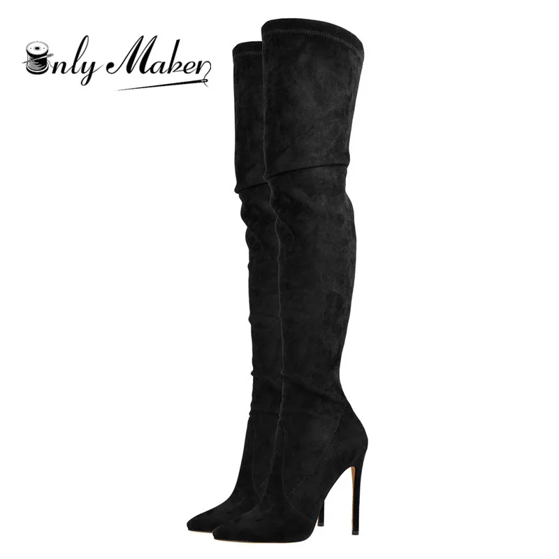 Onlymakerженские эластичные сапоги выше колена с острым носком; Сапоги на высоком каблуке 10-11 см из флока на молнии; Большие размеры US5-US15