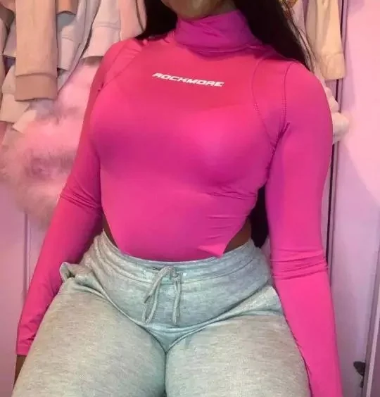 Женский Облегающий комбинезон, розовый комбинезон с высоким воротником и надписью, с длинным рукавом, Осенний обтягивающий комбинезон в стиле Харадзюку