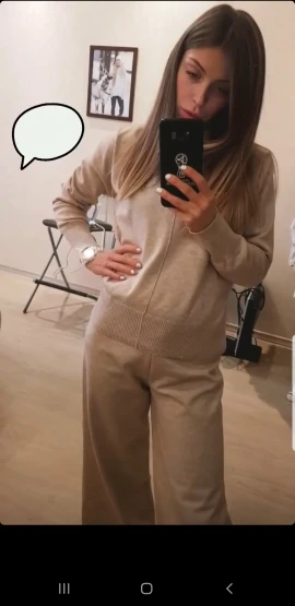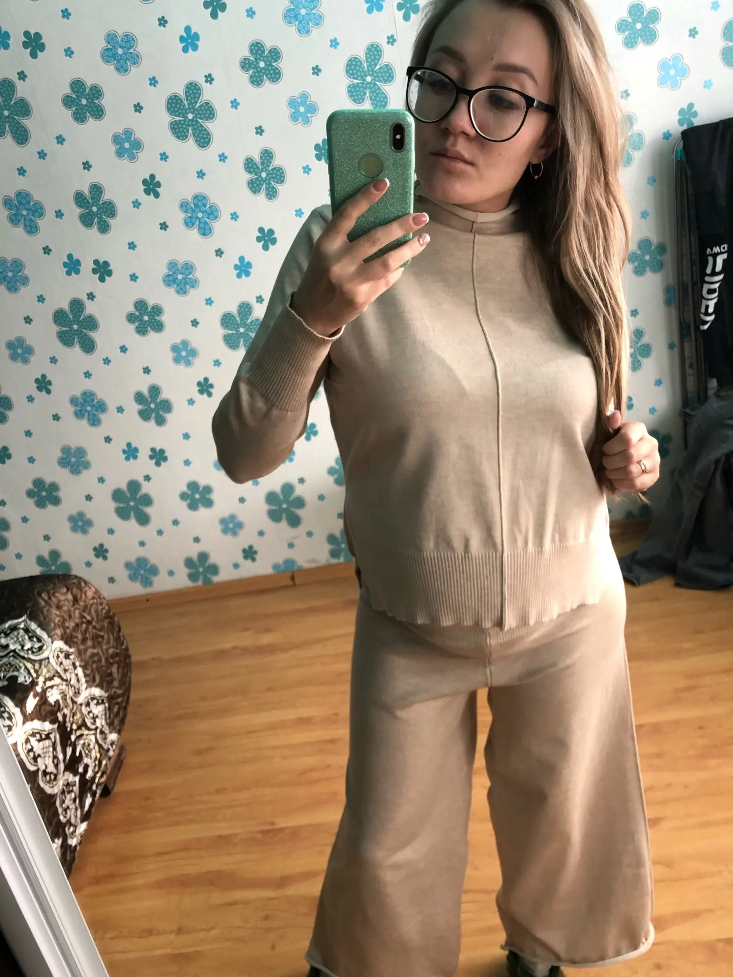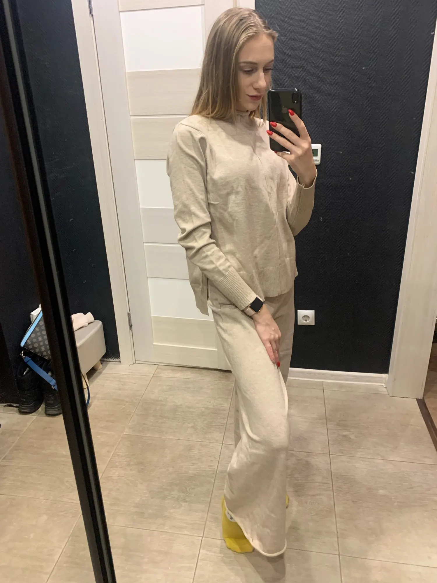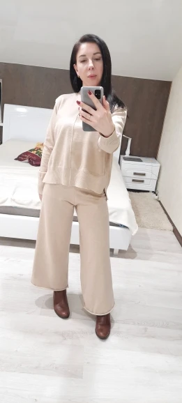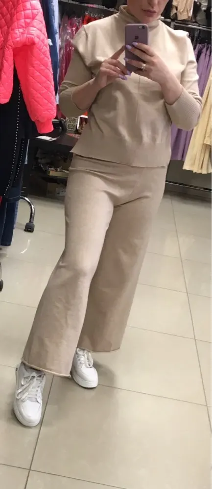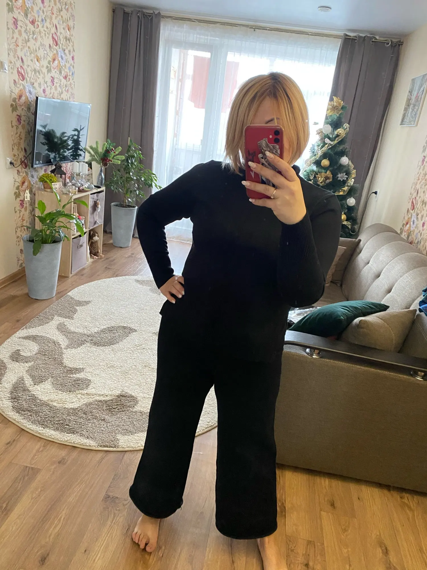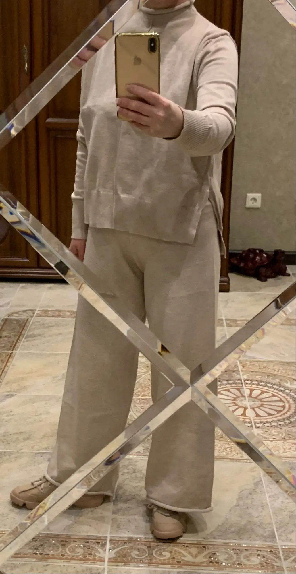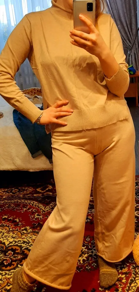 Тёплый, ткань скорее тонкая, но очень плотной машинной вязки. Очень хорошо тянется. Исполнение идеальное, ни одой точащей нитки. Неприятного запаха при распаковке не было. Представлен в едином размере и 2ух цветах. На мои параметры 79/63/89 отлично подошёл. Брюки широкие, комфортные, с завышенной талией, на резинке , не давит. На мой рост 161 полная длина штанин, на девочек выше будут короткие. Пуловер по спинке удлинённый, рукав полный длины. Больше обзоров в моем Инстаграм styleforme8 и телеграм styleforme8