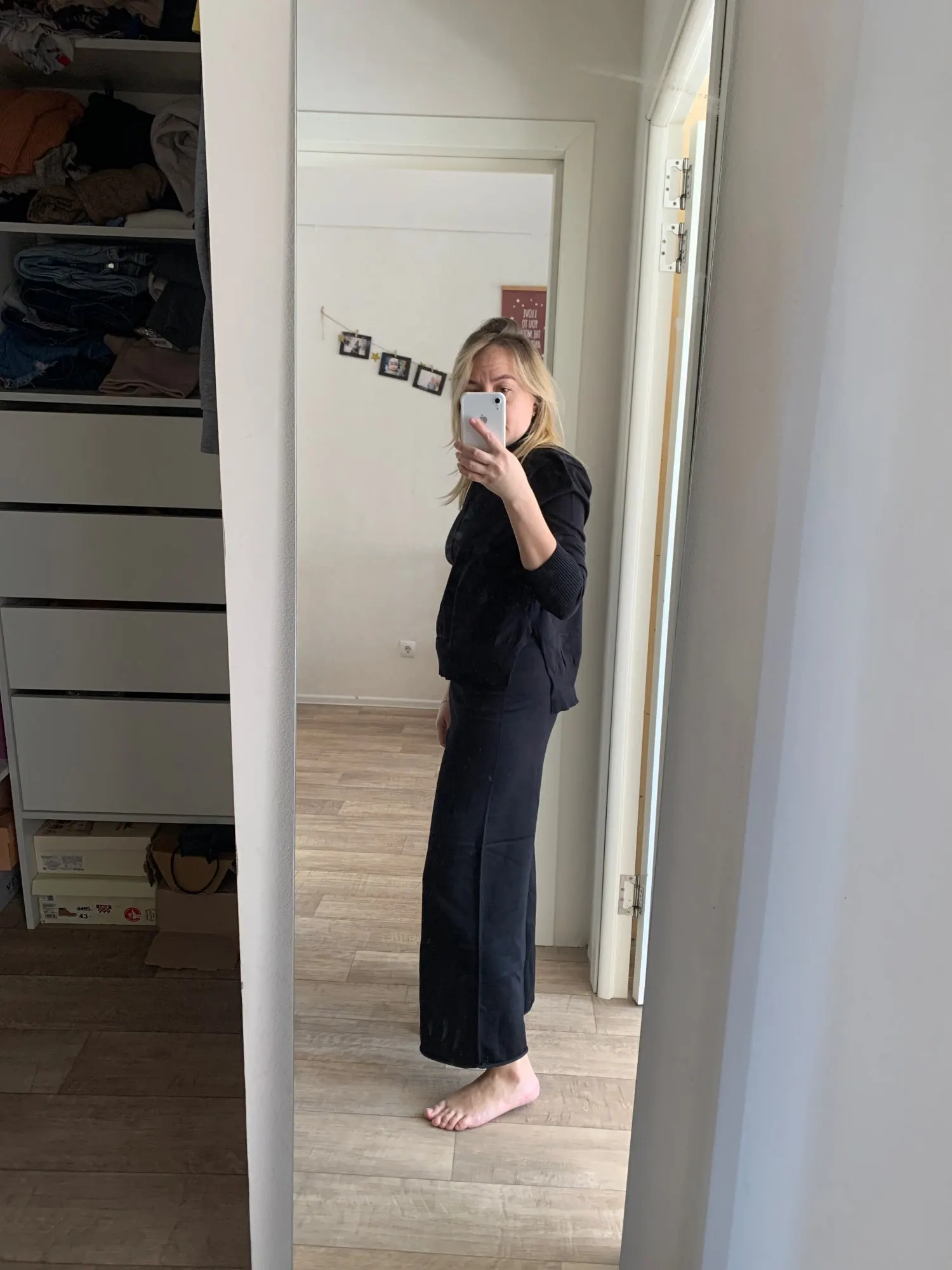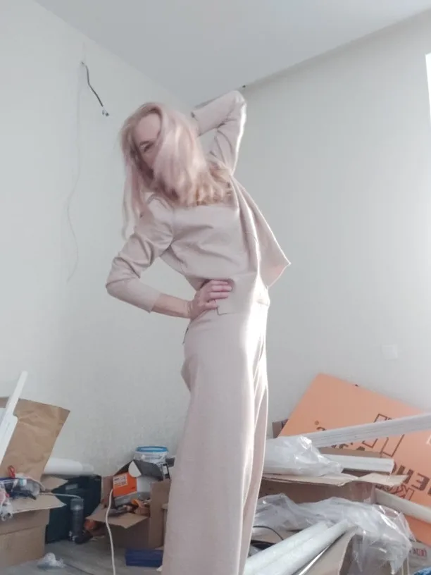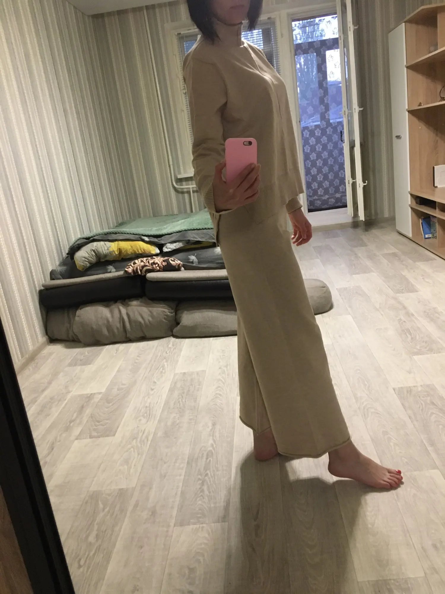 Хорошее качество, доставка меньше месяца. Любителям монохрома или костюмов советую однозначно. По фото казалось, что он более шерстяной, боялась, что в мае в нем будет уже жарко, но он как «мокрый» трикотаж, тяжелый и приятный на ощупь. Мои параметры ~85-60-85, вес 48кг., рост 163см. Длину штанин видео на фото, но длинее точно не нужно, будут все замусоленные. В начале было не обычно в таких широких штанах, как монах ))) но быстро привыкла, не хотелось снимать костюм.