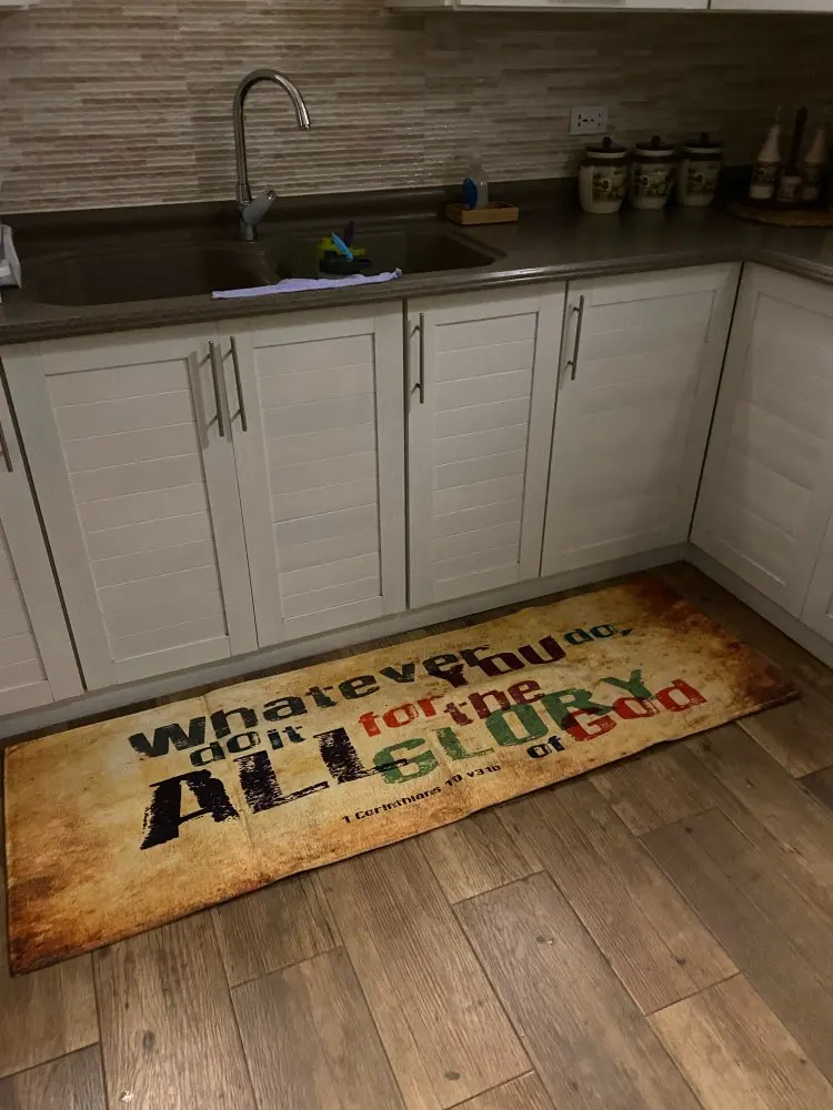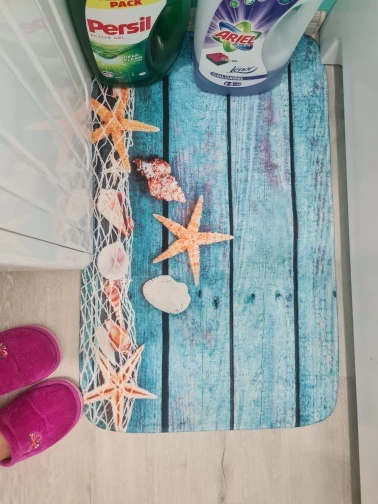 Коврик красивый и был быстрым. Но подумайте, что материал более собственный для ванной комнаты для кухни.