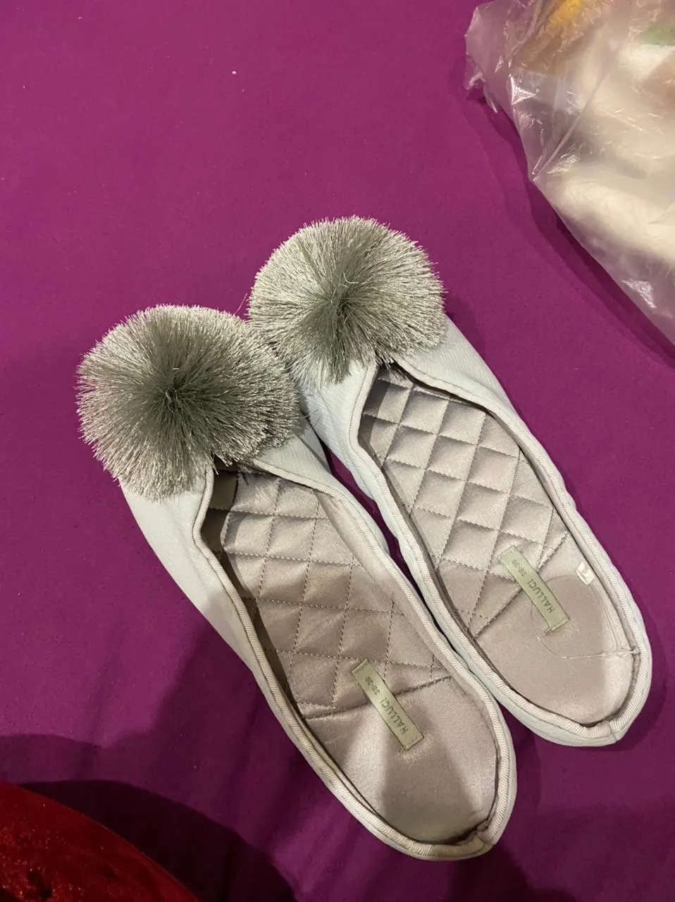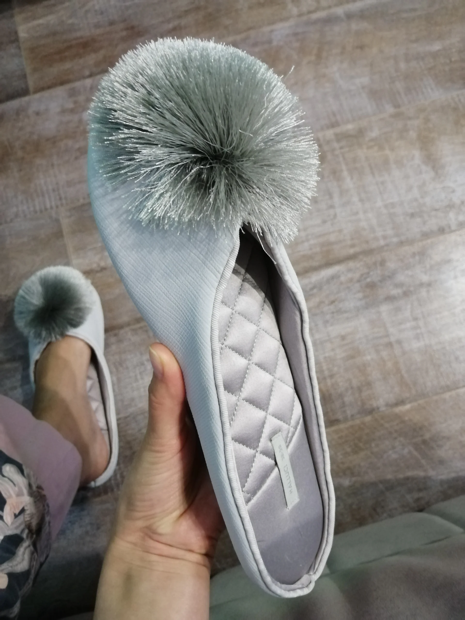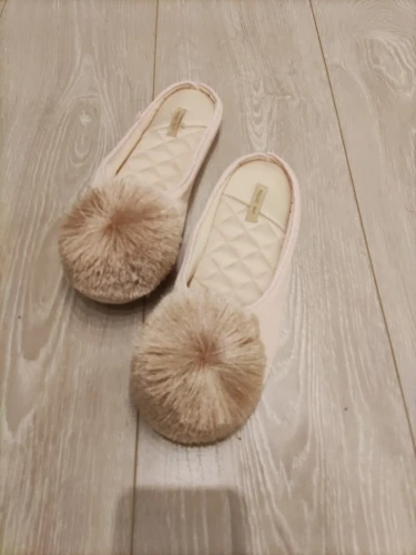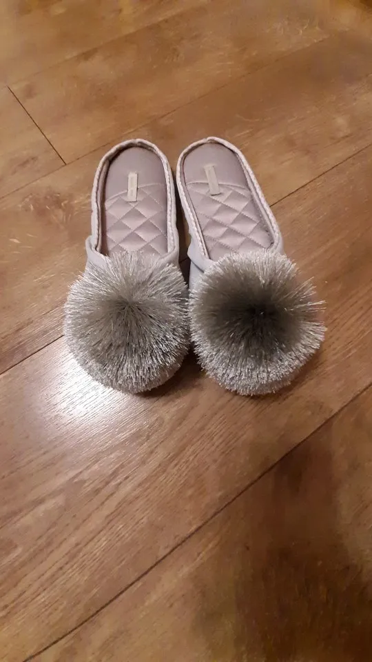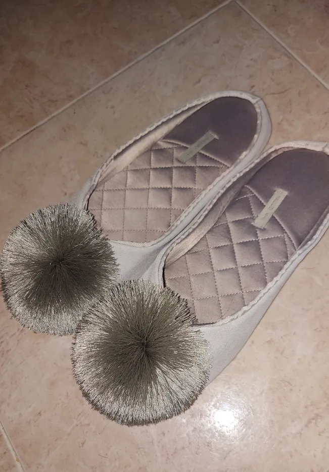 Тапочки пришли за 2 недели. В жизни такие же как на фото, очень симпатичные, выглядят красиво! У меня узкая нога, размер 39. Взяла 8,5 подошли идеально (на фото видно как сидят) Материал внутри приятный, нежный, шелковистый. Снаружи ткань неочень, шуршит когда проводишь рукой, похожа на плащевку (незнаю как правильно объяснить) ну может это + не сильно будут мараться и несложно будет отмыть загрязнения. Подошва толстая, но не резина, а что то другое. Скользит по ламинату, но не сильно.