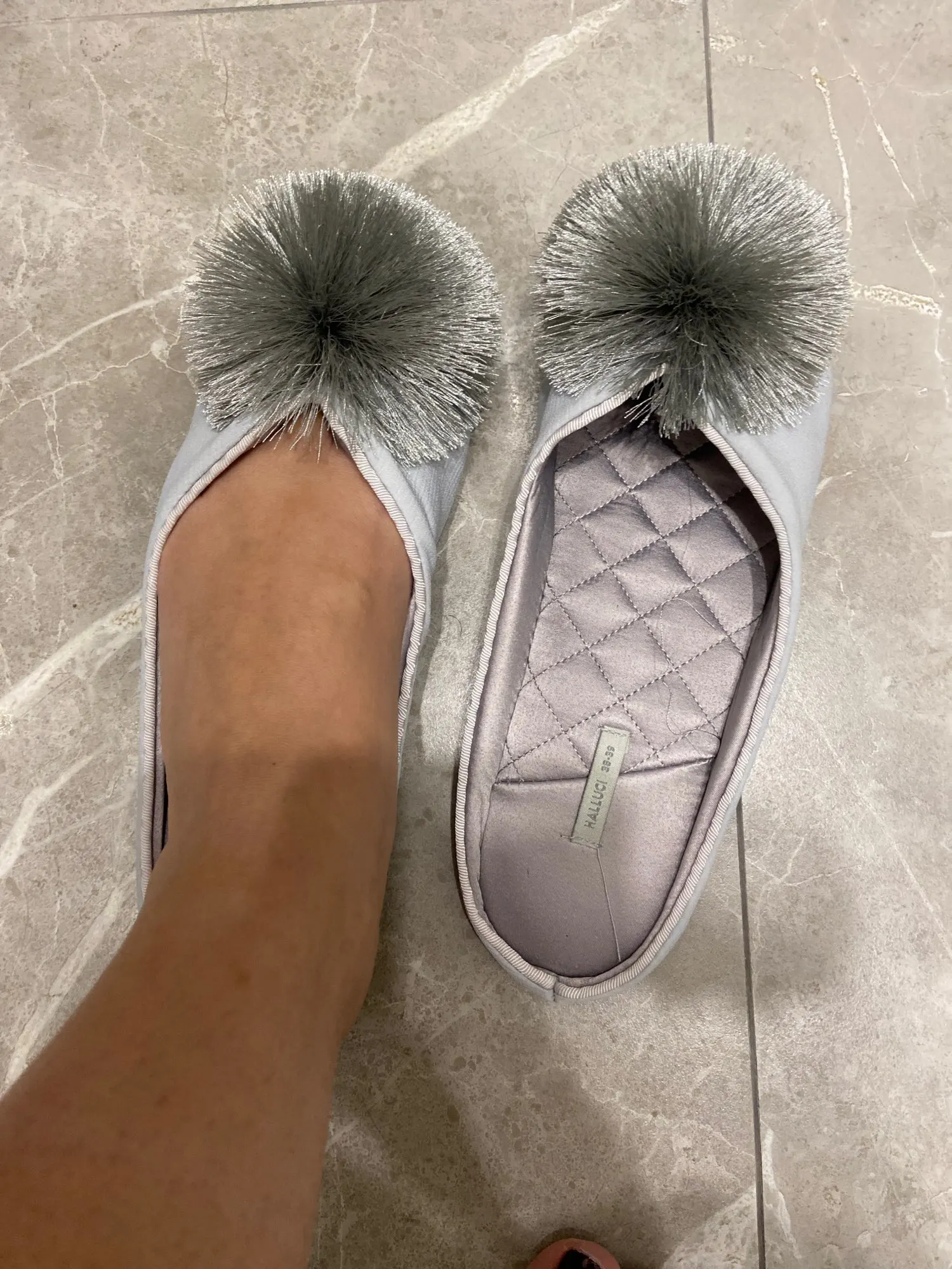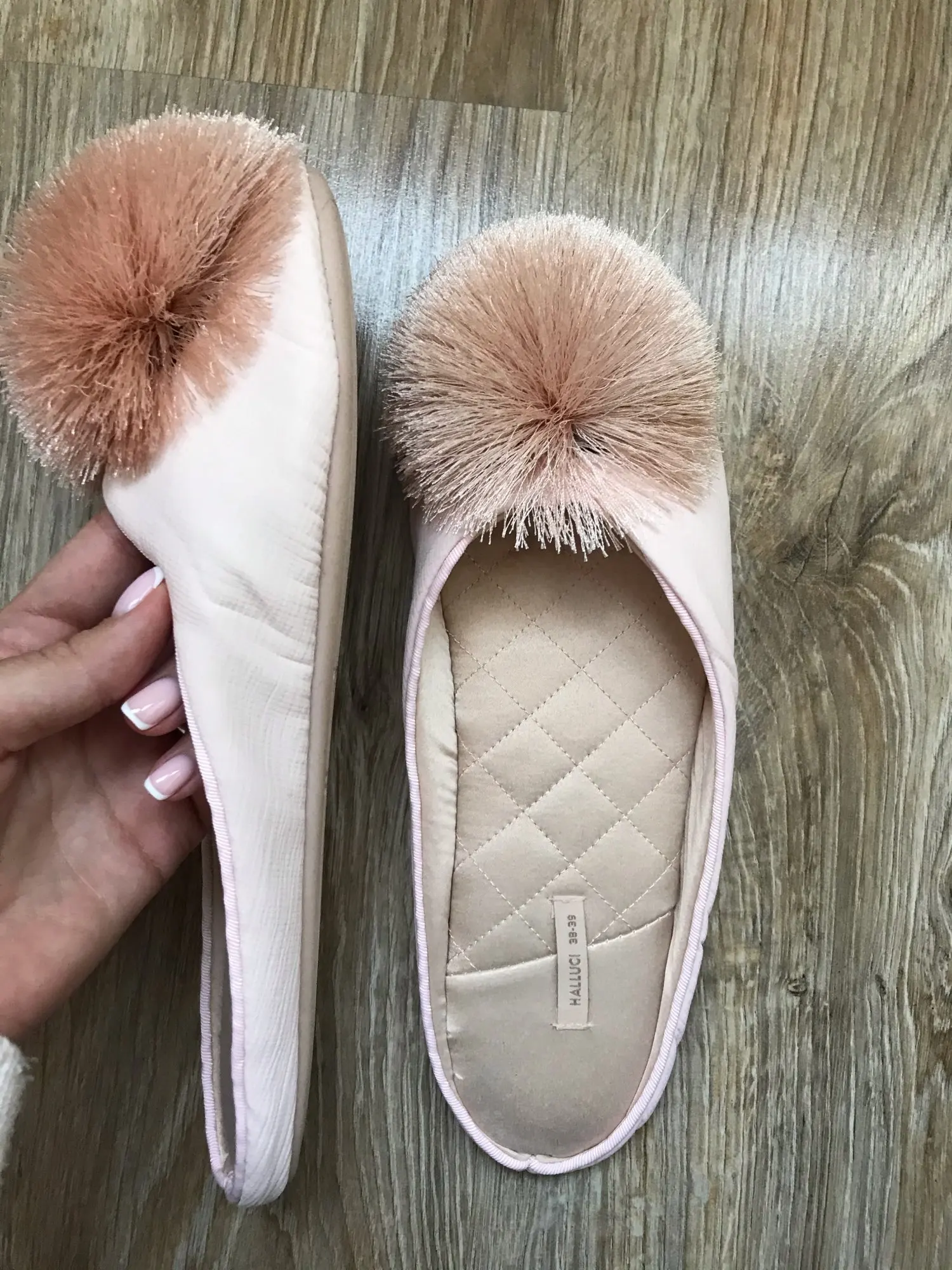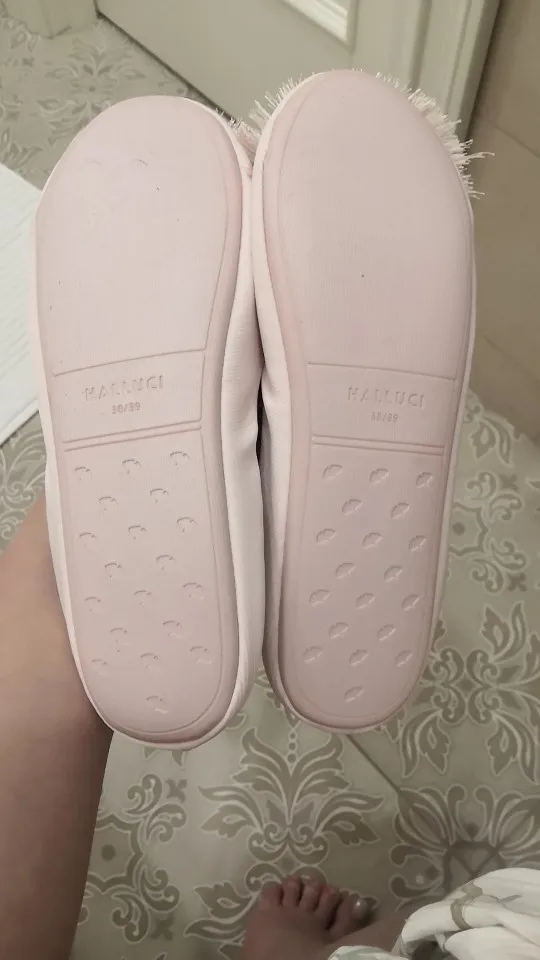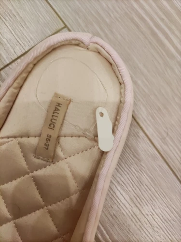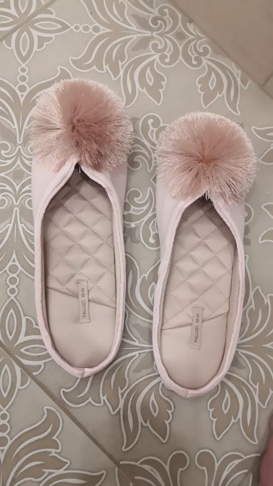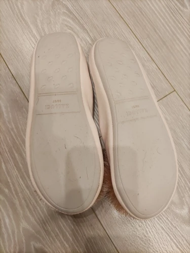 Тапочки пришли до Мск достаточно быстро, красивые, выглядят качественно, дорого, удобство не оценила пока, но по ощущениям комфортно, немного скрипят при ходьбе, на российский 38 брала 38-39,подошли хорошо, даже немного свободно(вообщем в размер)
