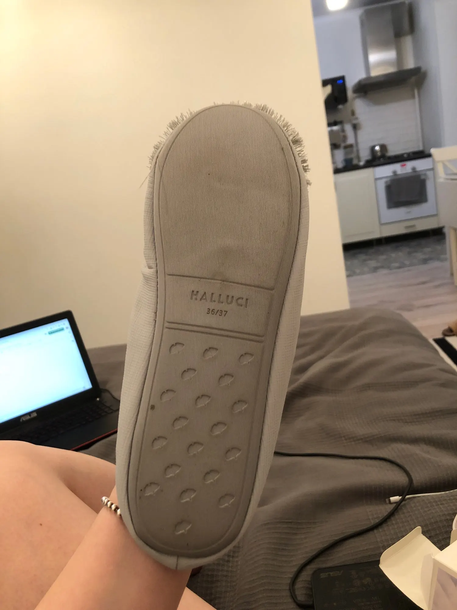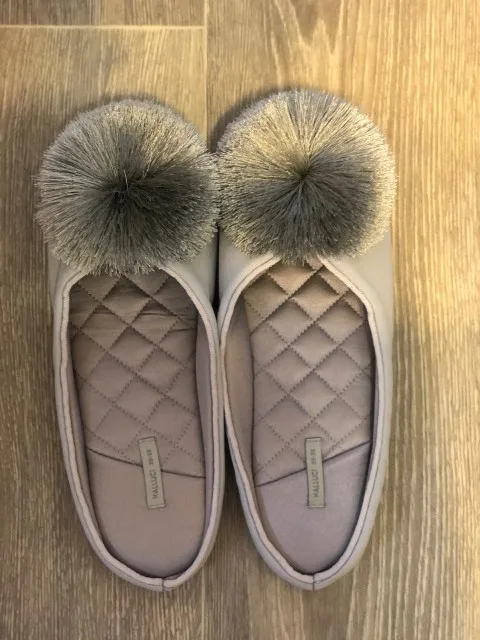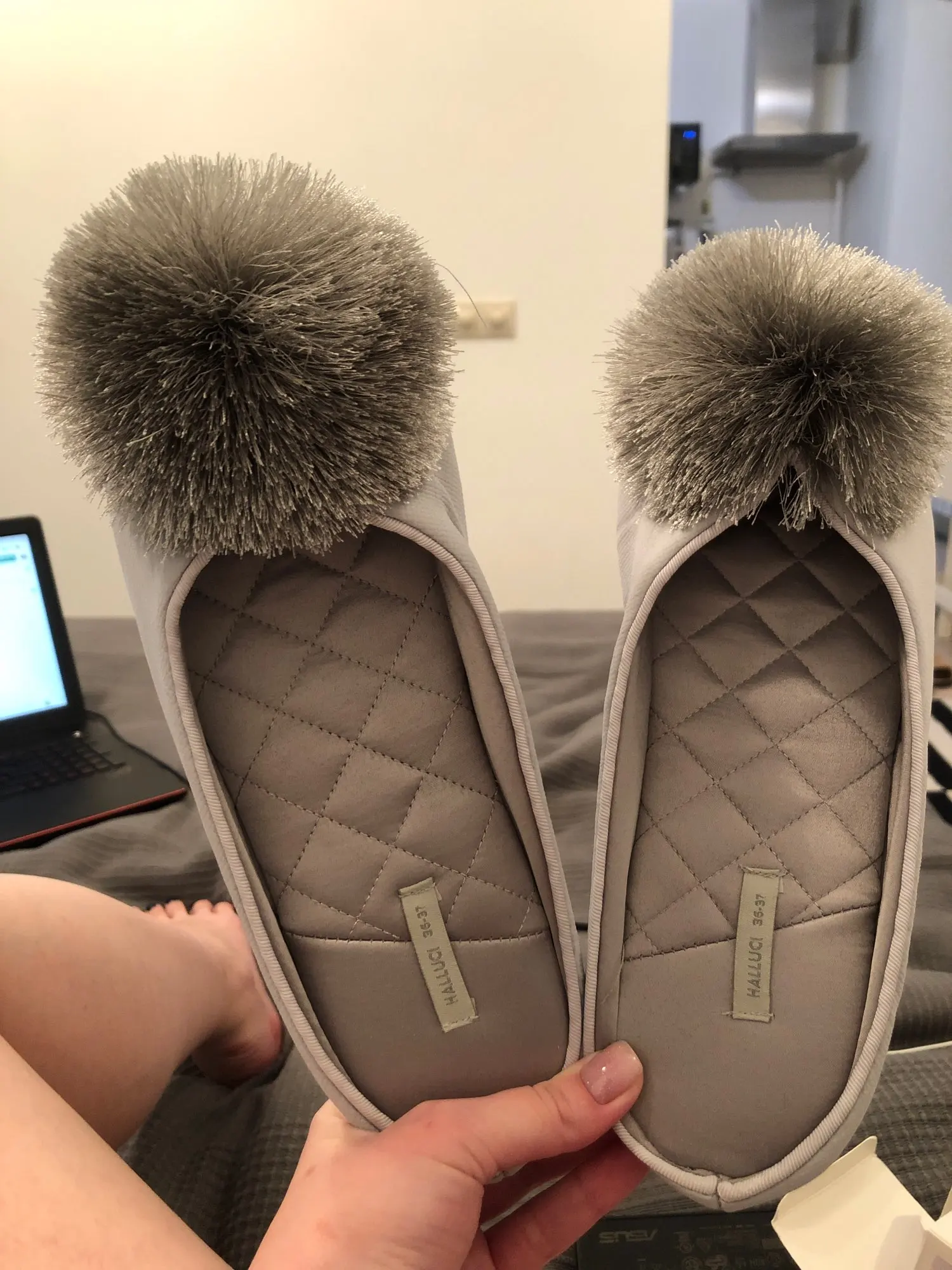 Тапочки пришли до Мск достаточно быстро, красивые, выглядят качественно, дорого, удобство не оценила пока, но по ощущениям комфортно, немного скрипят при ходьбе, на российский 38 брала 38-39,подошли хорошо, даже немного свободно(вообщем в размер)