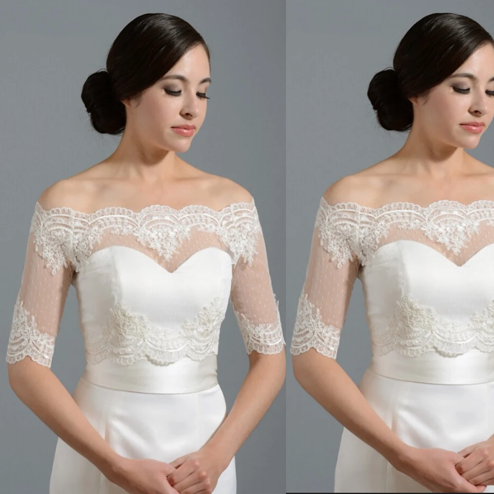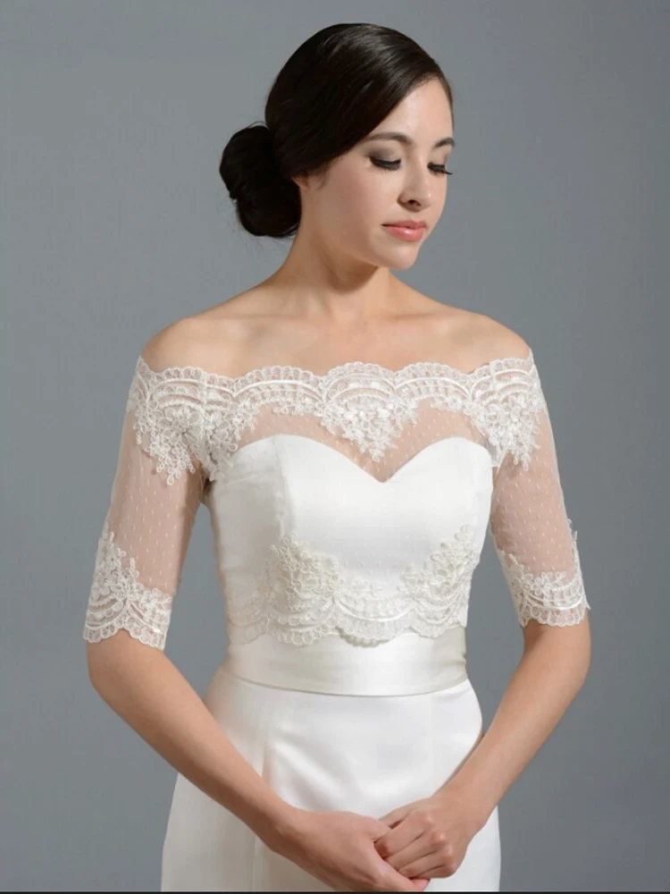 Свадебный жакет цвета слоновой кости с коротким рукавом, кружевной тюлевый Свадебный Болеро в горошек, Shrugs 2020, аппликация