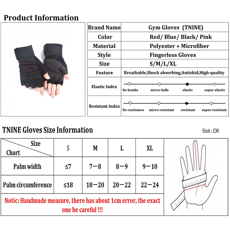 Стиль: перчатки с полупальцамиСезон: весна, лето, осень, зимаПовод: Спорт на открытом воздухеЦвет:Черный,Красный, синий, розовый, сапфир, черный, оранжевыйРазмер: S, M, L,XLОсобенности:1. 100% новый и высокое качество,2. Половинчатая конструкция, большой палец и костяшки могут сгибаться естественным образом,3. Моющиеся, дышащие, Нескользящие4. С дышащей обмоткой запястья, может защитить вас от повреждения запястья.