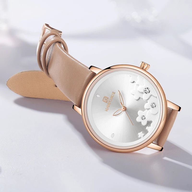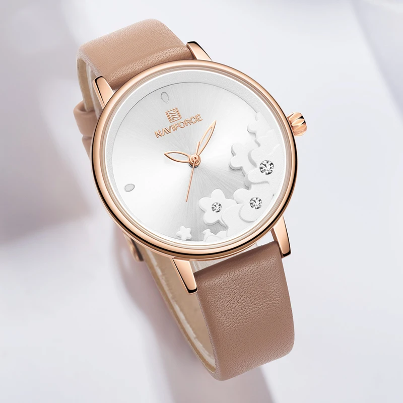NAVIFORCE Роскошные Брендовые женские часы с цветком, женские наручные часы с кожаным ремешком, женские модные кварцевые часы для девушек, розовое золото, Reloj Mujer